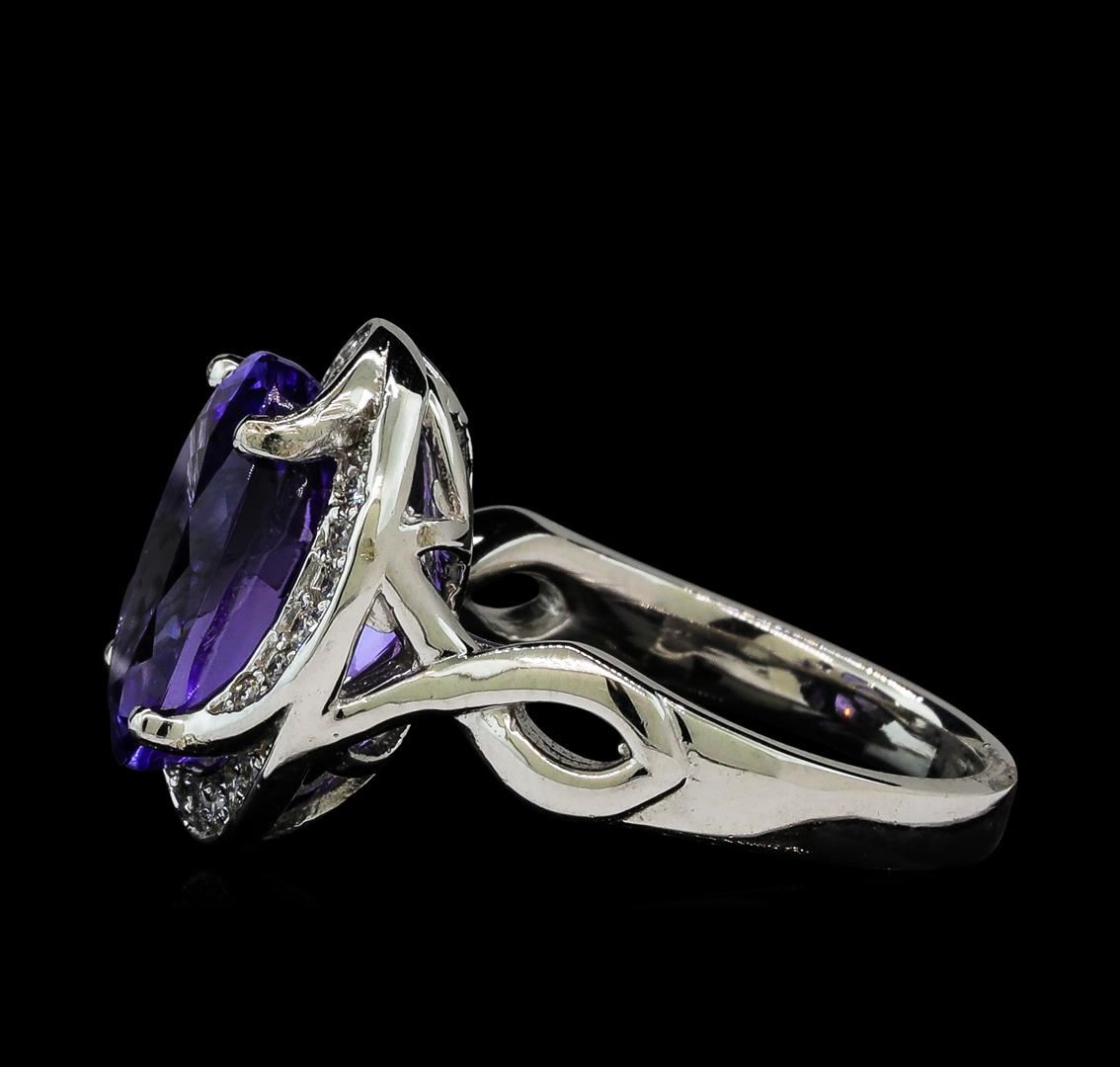 One electronically tested 14KT white gold lady's cast fashion ring with a crossover shank scalloped halo with a bright polish finish. The featured lady's ring has a shank measuring 2.69 millimeters wide. Identified with markings of '14K'. Condition is new, good workmanship. Containing: One prong set oval modified brilliant cut natural tanzanite, measuring 13.10 x 9.52 x 8.10mm, (depth est.) 3%. bulge factor, approximate weight of 7.25ct., clarity is eye clean, medium, moderately strong, violetish blue color, (GIA vB 5/4), cut is very good. Transmitting light with no distortion, transparent. Colored gemstones are presumed to have been subjected to commonly used enhancement processes. Graded in the setting. Twenty-Six prong set round brilliant cut diamonds, measuring 1.50 - 1.40 x 0.90mm (depth est.) approximate total weight of 26 Stones = 0.30ct. Graded in the setting. Clarity SI-1 to SI-2. Color: H - I Cut Good. Total Weight of Colored Stones 7.25ct.. Total Weight of Diamonds 0.30ct.. Total Weight of Ring 8.30gm. GAS Appraised at $13,535.00.