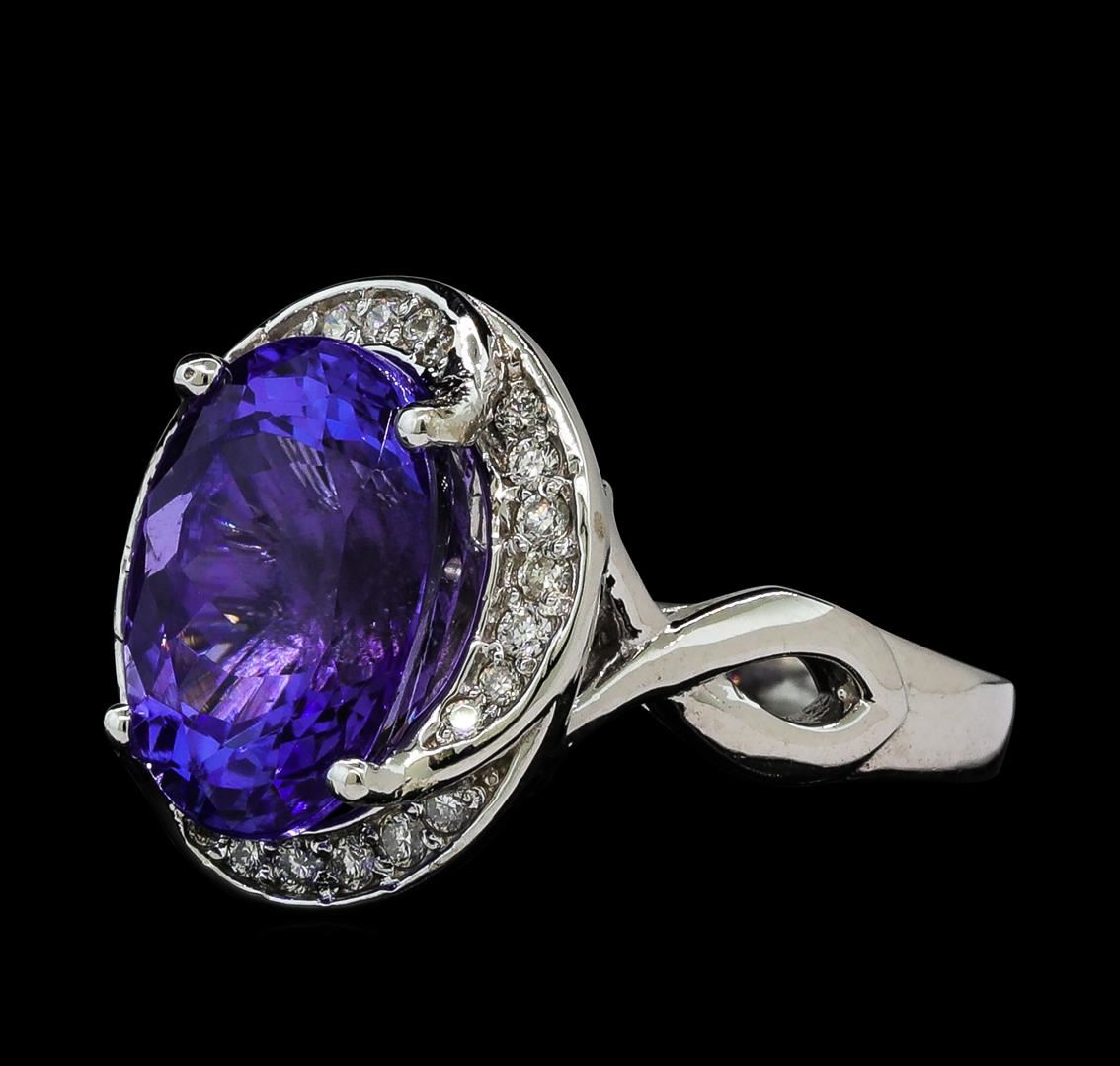 One electronically tested 14KT white gold lady's cast fashion ring with a crossover shank scalloped halo with a bright polish finish. The featured lady's ring has a shank measuring 2.69 millimeters wide. Identified with markings of '14K'. Condition is new, good workmanship. Containing: One prong set oval modified brilliant cut natural tanzanite, measuring 13.10 x 9.52 x 8.10mm, (depth est.) 3%. bulge factor, approximate weight of 7.25ct., clarity is eye clean, medium, moderately strong, violetish blue color, (GIA vB 5/4), cut is very good. Transmitting light with no distortion, transparent. Colored gemstones are presumed to have been subjected to commonly used enhancement processes. Graded in the setting. Twenty-Six prong set round brilliant cut diamonds, measuring 1.50 - 1.40 x 0.90mm (depth est.) approximate total weight of 26 Stones = 0.30ct. Graded in the setting. Clarity SI-1 to SI-2. Color: H - I Cut Good. Total Weight of Colored Stones 7.25ct.. Total Weight of Diamonds 0.30ct.. Total Weight of Ring 8.30gm. GAS Appraised at $13,535.00.