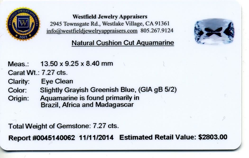 7.27ct Cushion Cut Natural Cushion Cut Aquamarine. Westfield Appraised at $2,803.00.
