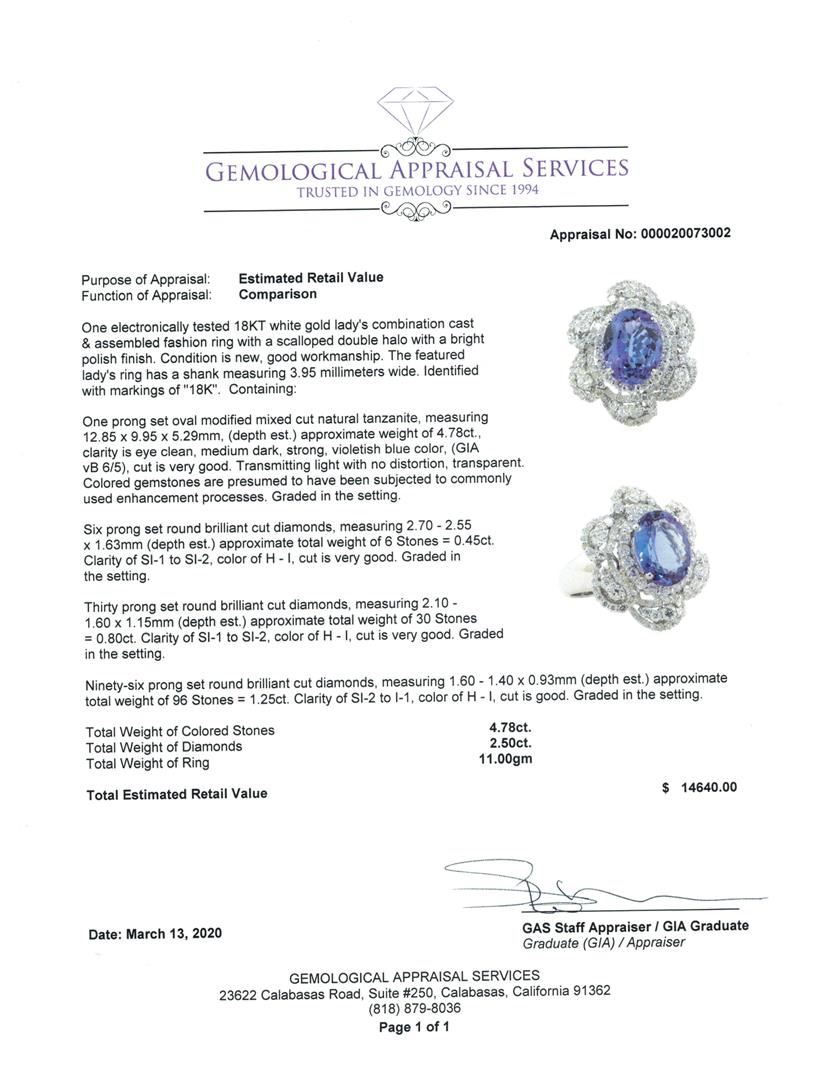One electronically tested 18KT white gold lady's combination cast & assembled fashion ring with a scalloped double halo with a bright polish finish. The featured lady's ring has a shank measuring 3.95 millimeters wide. Identified with markings of '18K'. Condition is new, good workmanship. Containing: One prong set oval modified mixed cut natural tanzanite, measuring 12.85 x 9.95 x 5.29mm, (depth est.) approximate weight of 4.78ct., clarity is eye clean, medium dark, strong, violetish blue color, (GIA vB 6/5), cut is very good. Transmitting light with no distortion, transparent. Colored gemstones are presumed to have been subjected to commonly used enhancement processes. Graded in the setting. Six prong set round brilliant cut diamonds, measuring 2.70 - 2.55 x 1.63mm (depth est.) approximate total weight of 6 Stones = 0.45ct. Graded in the setting. Color H - I Clarity SI-1 to SI-2 Cut Very Good Thirty prong set round brilliant cut diamonds, measuring 2.10 - 1.60 x 1.15mm (depth est.) approximate total weight of 30 Stones = 0.80 ct. Graded in the setting. Color H - I Clarity SI-1 to SI-2 Cut Very Good Ninety-Six prong set round brilliant cut diamonds, measuring 1.60 - 1.40 x 0.93mm (depth est.) approximate total weight of 96 Stones = 1.25ct. Graded in the setting. Color H - I Clarity SI-2 to I-1 Cut Good. Total Weight of Colored Stones 4.78ct.. Total Weight of Diamonds 2.50 ct.. Total Weight of Ring 11.00gm GAS Appraised at $14640.00. GAS Appraised.