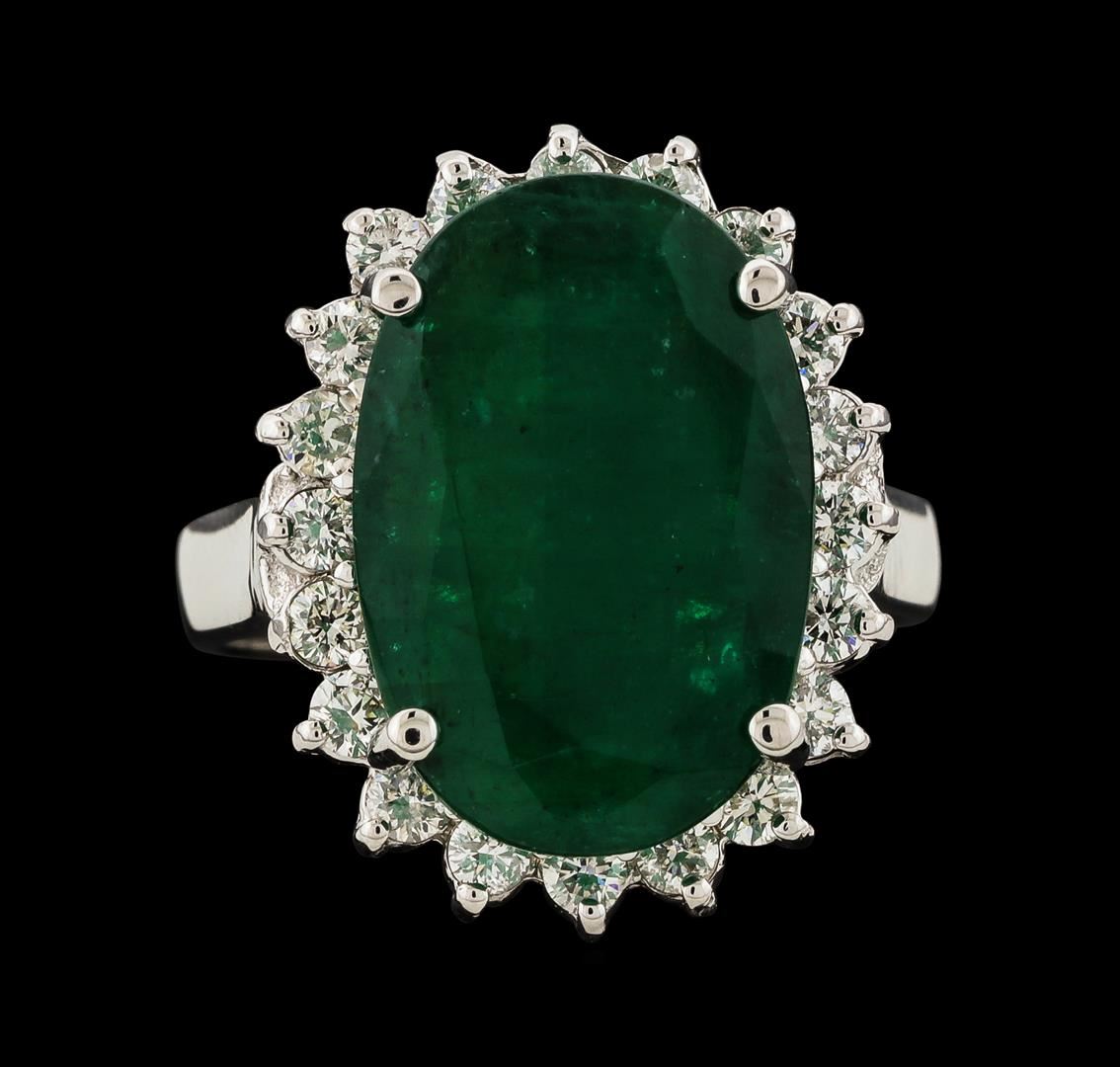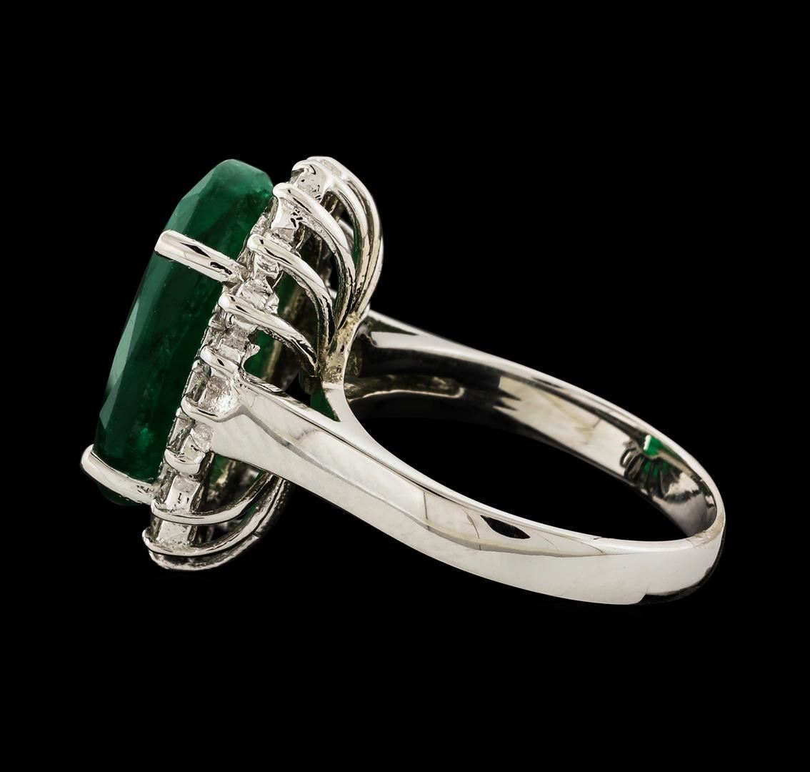 One electronically tested 14KT white gold lady's cast fashion ring with a basket halo with a bright polish finish. The featured lady's ring has a shank measuring 2.79 millimeters wide. Identified with markings of '14K'. Condition is new, good workmanship. Containing: One prong set oval modified mixed cut natural emerald, measuring 16.01 x 10.86 x 5.18mm, (depth est.) 25%. bulge factor, approximate weight of 7.30ct., clarity is heavily included, medium dark, moderately strong, green color, (GIA G 6/4), cut is good. Transmitting light somewhat diffusely, semi-transparent to translucent. Naturally occurring internal & external characteristics are present. Indications of oil residue. Colored gemstones are presumed to have been subjected to commonly used enhancement processes. Graded in the setting. Twenty prong set round brilliant cut diamonds, measuring 2.10 - 2.00 x 1.23mm (depth est.) approximate total weight of 20 Stones = 0.62ct. Graded in the setting. Clarity SI-1 to SI-2. Color: G - H Cut Good. Total Weight of Colored Stones 7.30ct.. Total Weight of Diamonds 0.62ct.. Total Weight of Ring 6.40gm GAS Appraised at $8,610.00.