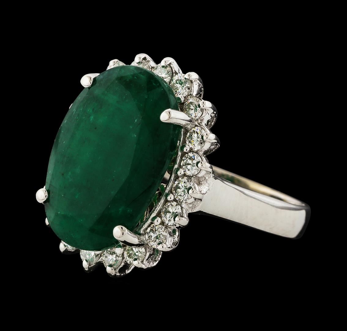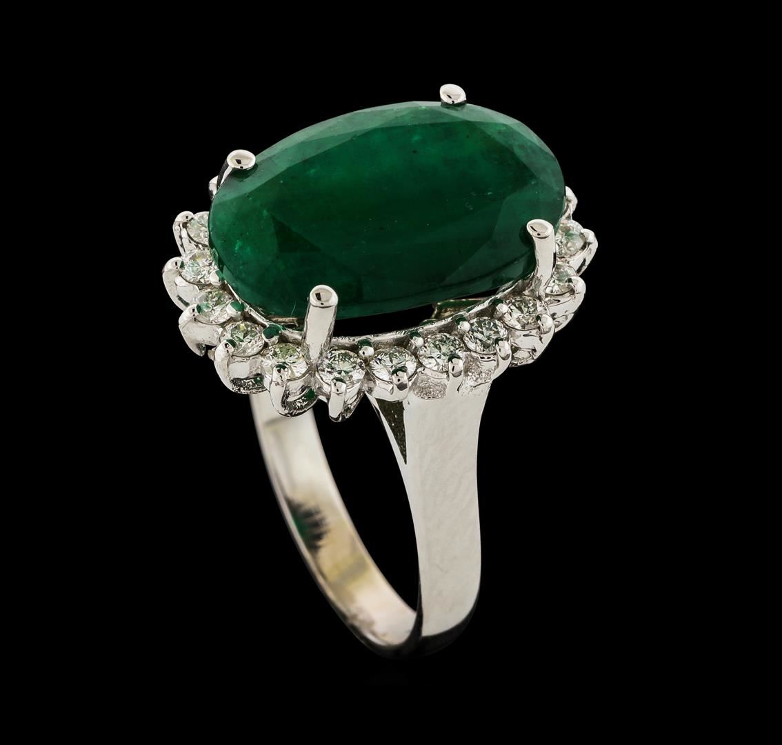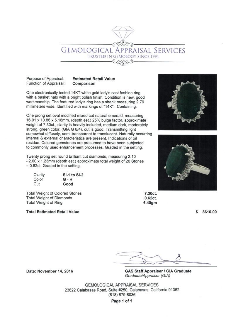 One electronically tested 14KT white gold lady's cast fashion ring with a basket halo with a bright polish finish. The featured lady's ring has a shank measuring 2.79 millimeters wide. Identified with markings of '14K'. Condition is new, good workmanship. Containing: One prong set oval modified mixed cut natural emerald, measuring 16.01 x 10.86 x 5.18mm, (depth est.) 25%. bulge factor, approximate weight of 7.30ct., clarity is heavily included, medium dark, moderately strong, green color, (GIA G 6/4), cut is good. Transmitting light somewhat diffusely, semi-transparent to translucent. Naturally occurring internal & external characteristics are present. Indications of oil residue. Colored gemstones are presumed to have been subjected to commonly used enhancement processes. Graded in the setting. Twenty prong set round brilliant cut diamonds, measuring 2.10 - 2.00 x 1.23mm (depth est.) approximate total weight of 20 Stones = 0.62ct. Graded in the setting. Clarity SI-1 to SI-2. Color: G - H Cut Good. Total Weight of Colored Stones 7.30ct.. Total Weight of Diamonds 0.62ct.. Total Weight of Ring 6.40gm GAS Appraised at $8,610.00.