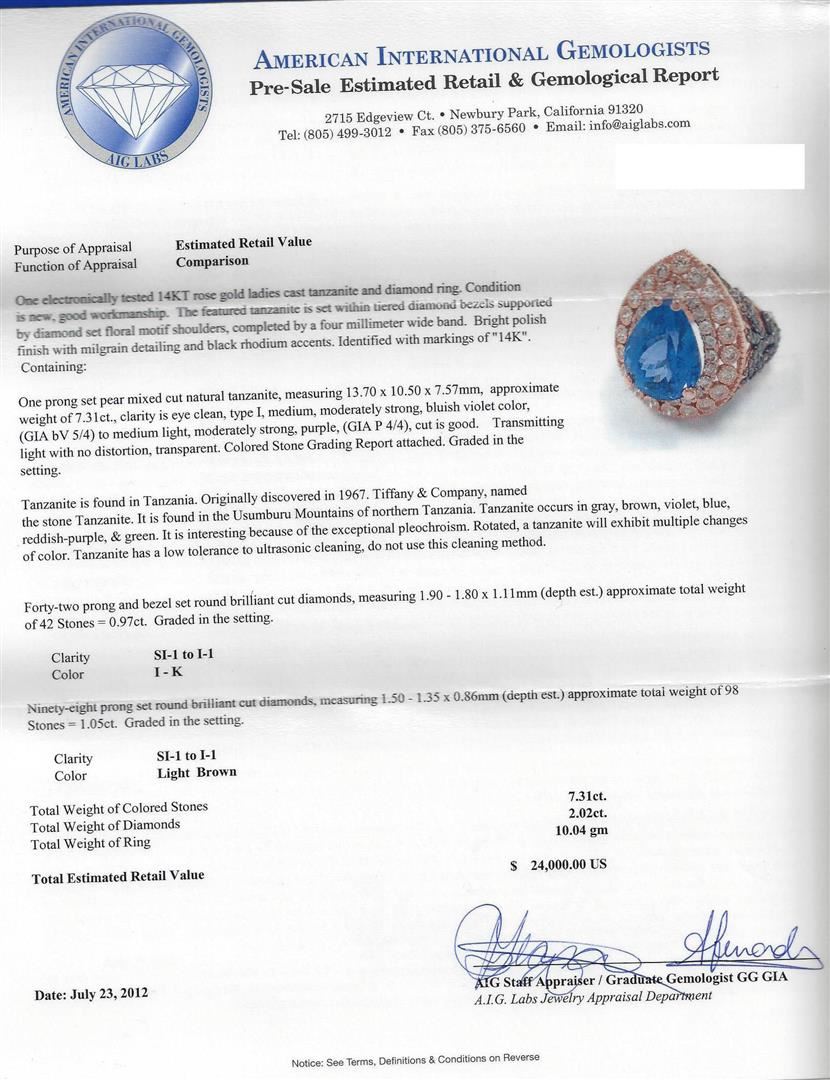 One electronically tested 14KT rose gold ladies cast tanzanite and diamond ring. The featured tanzanite is set within tiered diamond bezels supported by diamond set floral motif shoulders, completed by a four millimeter wide band. Bright polish finish with milgrain detailing and black rhodium accents. Identified with markings of "14K". Condition is new, good workmanship. Containing: One prong set pear mixed cut natural tanzanite, measuring 13.70 x 10.50 x 7.57mm, approximate weight of 7.31ct., clarity is eye clean, type I, medium, moderately strong, bluish violet color, (GIA bV 5/4) to medium light, moderately strong, purple, (GIA P 4/4), cut is good. Transmitting light with no distortion, transparent. Colored Stone Grading Report attached. Graded in the setting. Tanzanite is found in Tanzania. Originally discovered in 1967. Tiffany & Company, named the stone Tanzanite. It is found in the Usumburu Mountains of northern Tanzania. Tanzanite occurs in gray, brown, violet, blue, reddish-purple, & green. It is interesting because of the exceptional pleochroism. Rotated, a tanzanite will exhibit multiple changes of color. Tanzanite has a low tolerance to ultrasonic cleaning, do not use this cleaning method. Forty-Two prong and bezel set round brilliant cut diamonds, measuring 1.90 - 1.80 x 1.11mm (depth est.) approximate total weight of 42 Stones = 0.97ct. Graded in the setting. Clarity: SI-1 to I-1. Color: I - K Ninety-Eight prong set round brilliant cut diamonds, measuring 1.50 - 1.35 x 0.86mm (depth est.) approximate total weight of 98 Stones = 1.05ct. Graded in the setting. Clarity: SI-1 to I-1. Total Weight of Colored Stones 7.31ct. Total Weight of Diamonds 2.02ct. AIG Appraised at $24,000.00.