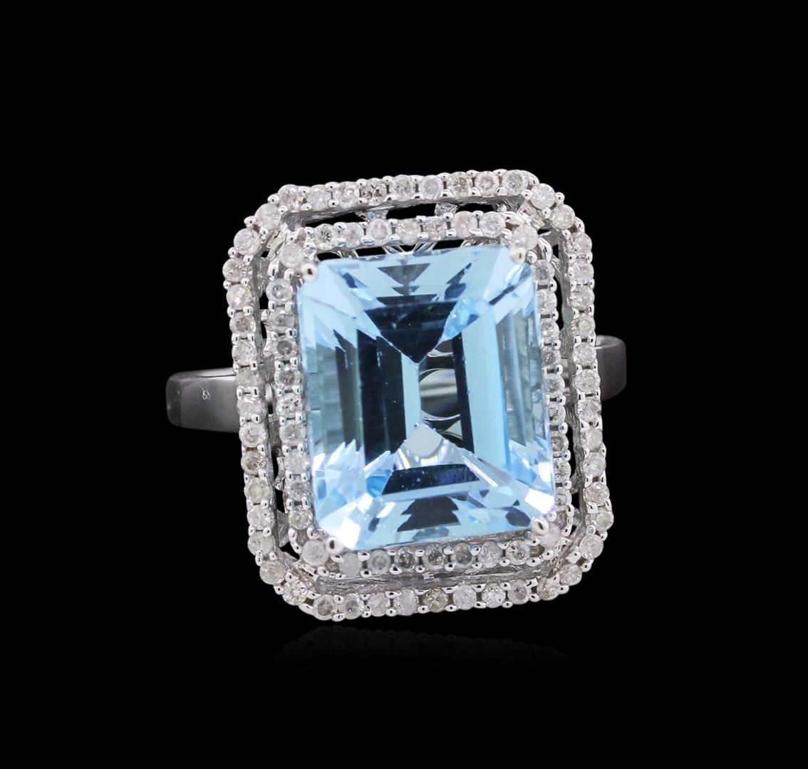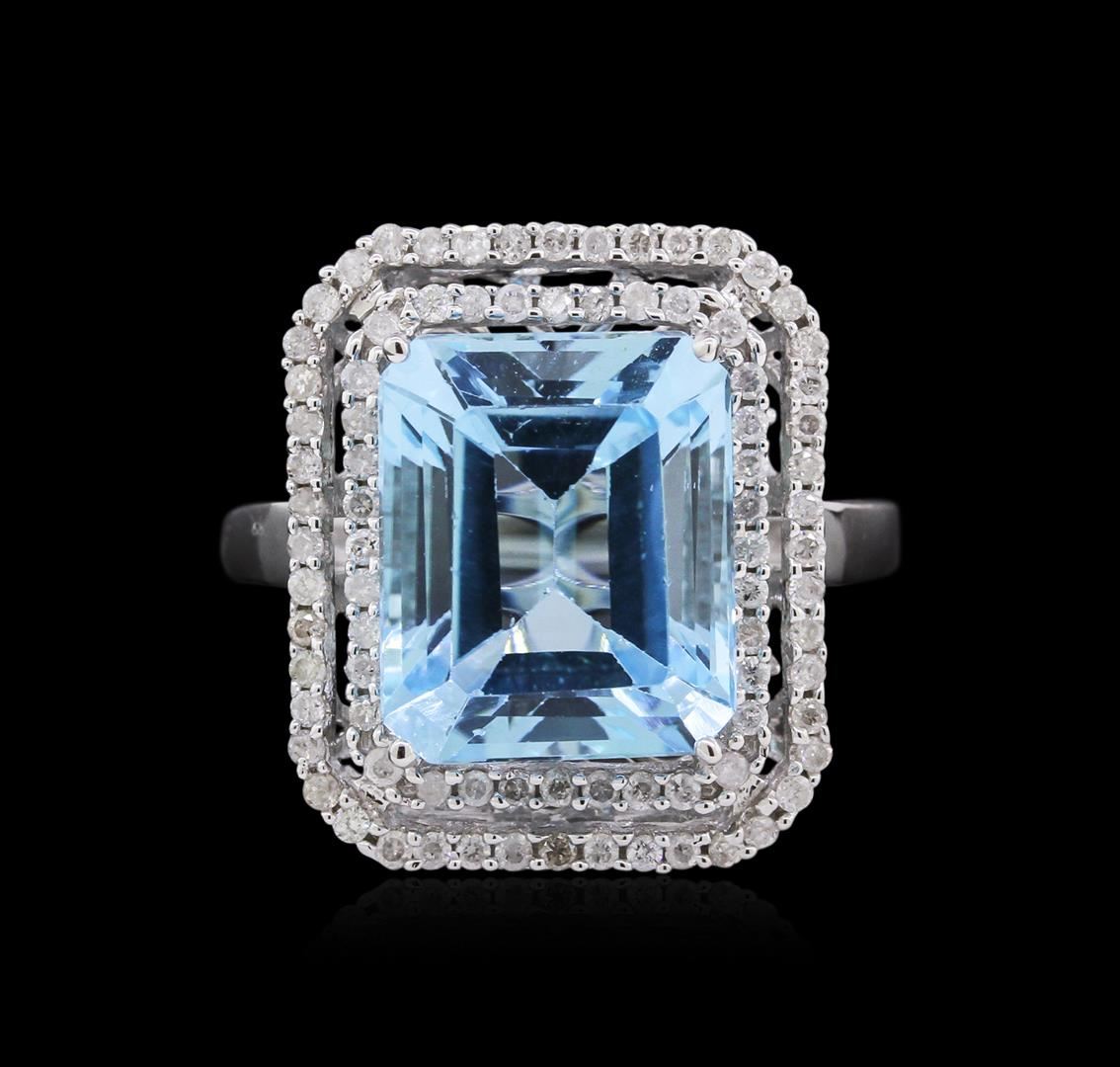 One 14KT white gold blue topaz and diamond ring. An emerald cut blue topaz gemstone is prong mounted in the center of the ring. Round brilliant cut diamonds accent the ring around the center gemstone and on both sides. The ring is cast stamped "14K" and has a gross weight of 4.9 Grams. Diamond(s): Shape: Round Brilliant Cut. Weight: 0.45 carat. Average Clarity: I1. Average Color: H-J. Symmetry: Very Good. Polish: Very Good. GemStone(s): Topaz. Nature: Natural. Shape: Emerald, Faceted. Quantity: 1, Mounted. Weight: 7.31 carat. Dimensions: Length - 11.84 mm. ; Width - 9.85 mm. Bulge: Visible. Clarity: VS, Type 1. Color: Greenish Blue (3/3). Symmetry: Very Good. Color Intensity: Medium. Transparency: Transparent. Tone: Medium. Metal(s): Metal: Gold, Stamped. Purity: 14K. Color: White. Condition: Excellent. Finish: High polish. GGA Appraised at $4,465.00.