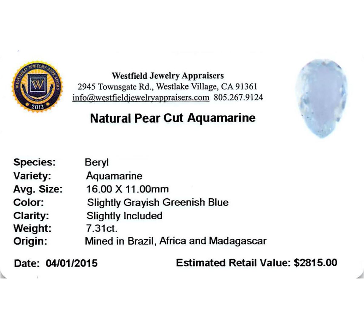 One pear cut natural aquamarine exact weight 7.31ct., clarity is slightly included, type I, medium, slightly grayish, very slightly greenish blue color, (GIA vslgB 5/2), cut is good. Westfield Appraised at $2,815.00.