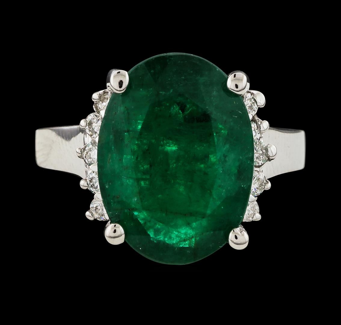 One electronically tested 14KT white gold lady's cast fashion ring with a cathedral shank with a bright polish finish. The featured lady's ring has diamond set shoulders and a shank measuring 2.08 millimeters wide. Identified with markings of '14K'. Condition is new, good workmanship. Containing: One prong set oval modified mixed cut natural emerald, measuring 15.16 x 11.30 x 6.01mm, (depth est.) 20%. bulge factor, approximate weight of 7.35ct., clarity is heavily included, medium dark, moderately strong, green color, (GIA G 6/4), cut is good. Transmitting light somewhat diffusely, semi-transparent to translucent. Naturally occurring internal & external characteristics are present. Indications of oil residue. Colored gemstones are presumed to have been subjected to commonly used enhancement processes. Graded in the setting. Ten prong set round brilliant cut diamonds, measuring 1.90 - 1.80 x 1.11mm (depth est.) approximate total weight of 10 Stones = 0.23ct. Graded in the setting. Clarity SI-1 to SI-2. Color: G - H Cut Good. Total Weight of Colored Stones 7.35ct.. Total Weight of Diamonds 0.23ct.. Total Weight of Ring 7.00gm GAS Appraised at $7,960.00.