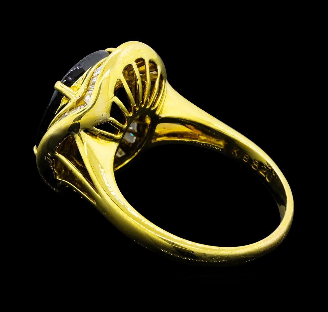 One electronically tested 18KT yellow gold lady's cast fashion ring with a scalloped basket halo with a bright polish finish. The featured lady's ring has a shank measuring 2.50 millimeters wide. Identified with markings of '18K'. Condition is like new, good workmanship. Containing: One prong set oval modified mixed cut natural blue sapphire, measuring 12.67 x 11.10 x 6.22mm, (depth est.) approximate weight of 7.35ct., clarity is moderately included, dark, strong, blue color, (GIA B 7/5), cut is good. Transmitting light somewhat diffusely, transparent to translucent. Colored gemstones are presumed to have been subjected to commonly used enhancement processes. Graded in the setting. Thirty-Six channel set baguette cut (tapered) diamonds, measuring from 2.50 x 1.30 x 1.11mm (depth est.) to 3.10 x 1.50 x 1.28mm (depth est.) approximate total weight of 36 Stones = 1.55ct. Graded in the setting. Color H - I Clarity VS-2 to SI-2 Cut Very Good. Total Weight of Colored Stones 7.35ct.. Total Weight of Diamonds 1.55ct.. Total Weight of Ring 9.80gm GAS Appraised at $20680.00. GAS Appraised at $20,680.00.