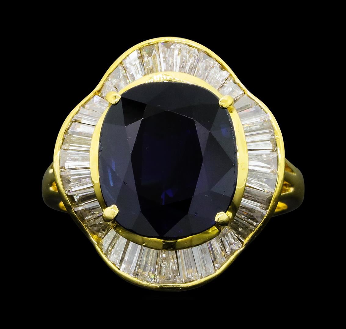 One electronically tested 18KT yellow gold lady's cast fashion ring with a scalloped basket halo with a bright polish finish. The featured lady's ring has a shank measuring 2.50 millimeters wide. Identified with markings of '18K'. Condition is like new, good workmanship. Containing: One prong set oval modified mixed cut natural blue sapphire, measuring 12.67 x 11.10 x 6.22mm, (depth est.) approximate weight of 7.35ct., clarity is moderately included, dark, strong, blue color, (GIA B 7/5), cut is good. Transmitting light somewhat diffusely, transparent to translucent. Colored gemstones are presumed to have been subjected to commonly used enhancement processes. Graded in the setting. Thirty-Six channel set baguette cut (tapered) diamonds, measuring from 2.50 x 1.30 x 1.11mm (depth est.) to 3.10 x 1.50 x 1.28mm (depth est.) approximate total weight of 36 Stones = 1.55ct. Graded in the setting. Color H - I Clarity VS-2 to SI-2 Cut Very Good. Total Weight of Colored Stones 7.35ct.. Total Weight of Diamonds 1.55ct.. Total Weight of Ring 9.80gm GAS Appraised at $20680.00. GAS Appraised at $20,680.00.