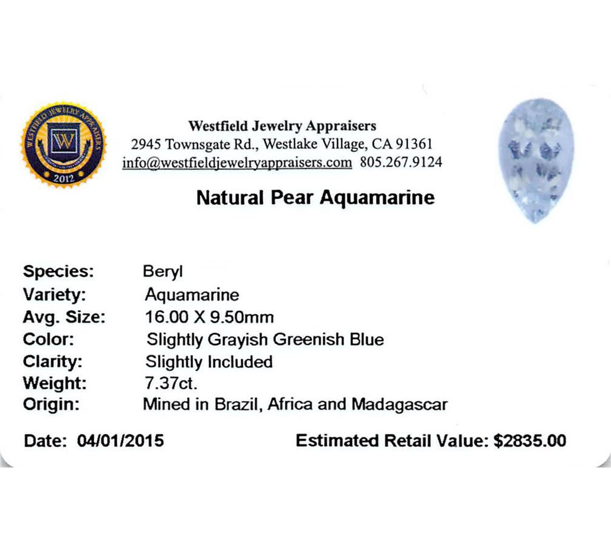 One pear cut natural aquamarine exact weight 7.37ct., clarity is slightly included, type I, medium, slightly grayish, very slightly greenish blue color, (GIA vslgB 5/2), cut is good. Westfield Appraised at $2,835.00.