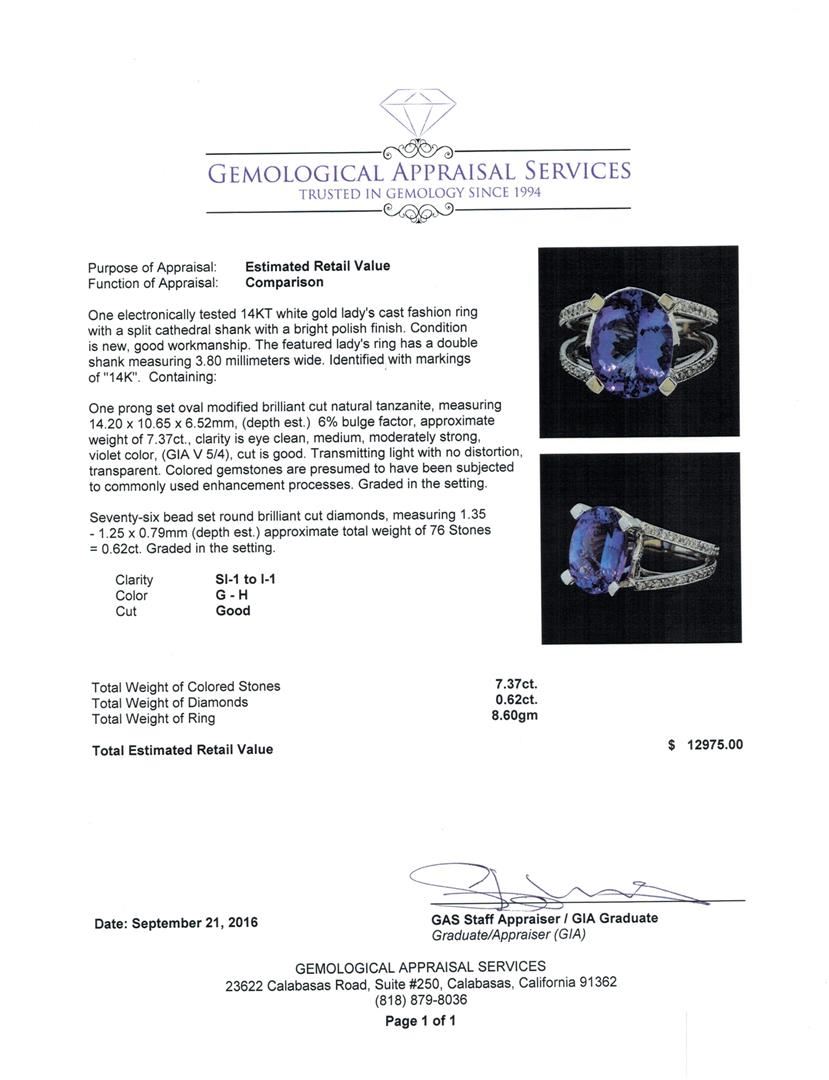 One electronically tested 14KT white gold lady's cast fashion ring with a split cathedral shank with a bright polish finish. The featured lady's ring has a double shank measuring 3.80 millimeters wide. Identified with markings of '14K'. Condition is new, good workmanship. Containing: One prong set oval modified brilliant cut natural tanzanite, measuring 14.20 x 10.65 x 6.52mm, (depth est.) 6%. bulge factor, approximate weight of 7.37ct., clarity is eye clean, medium, moderately strong, violet color, (GIA V 5/4), cut is good. Transmitting light with no distortion, transparent. Colored gemstones are presumed to have been subjected to commonly used enhancement processes. Graded in the setting. Seventy-Six bead set round brilliant cut diamonds, measuring 1.35 - 1.25 x 0.79mm (depth est.) approximate total weight of 76 Stones = 0.62ct. Graded in the setting. Clarity SI-1 to I-1. Color: G - H Cut Good. Total Weight of Colored Stones 7.37ct.. Total Weight of Diamonds 0.62ct.. Total Weight of Ring 8.60gm. GAS Appraised at $12,975.00.