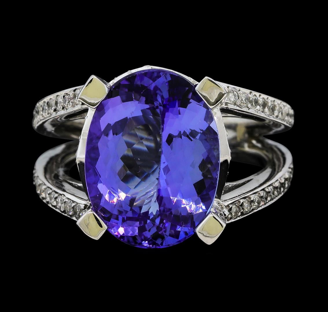 One electronically tested 14KT white gold lady's cast fashion ring with a split cathedral shank with a bright polish finish. The featured lady's ring has a double shank measuring 3.80 millimeters wide. Identified with markings of '14K'. Condition is new, good workmanship. Containing: One prong set oval modified brilliant cut natural tanzanite, measuring 14.20 x 10.65 x 6.52mm, (depth est.) 6%. bulge factor, approximate weight of 7.37ct., clarity is eye clean, medium, moderately strong, violet color, (GIA V 5/4), cut is good. Transmitting light with no distortion, transparent. Colored gemstones are presumed to have been subjected to commonly used enhancement processes. Graded in the setting. Seventy-Six bead set round brilliant cut diamonds, measuring 1.35 - 1.25 x 0.79mm (depth est.) approximate total weight of 76 Stones = 0.62ct. Graded in the setting. Clarity SI-1 to I-1. Color: G - H Cut Good. Total Weight of Colored Stones 7.37ct.. Total Weight of Diamonds 0.62ct.. Total Weight of Ring 8.60gm. GAS Appraised at $12,975.00.