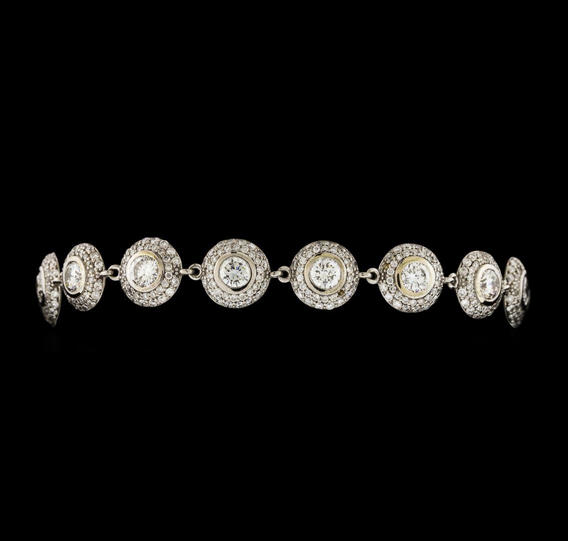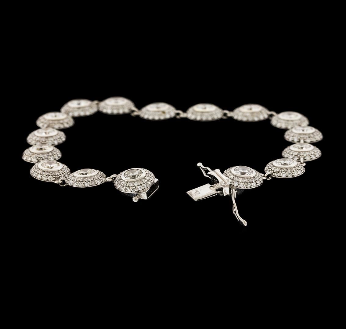 One electronically tested 14KT white gold ladies cast & assembled diamond bracelet. Seven inch length bracelet features a flexible diamond and diamond bezel ribbon, terminating in a concealed clasp with twin safeties. Bright polish finish. Identified with markings of '14K'. Condition is good. Containing: Sixteen bezel set round brilliant cut diamonds, measuring 4.20 - 4.10 x 2.49mm (depth est.) approximate total weight of 16 Stones = 4.28ct. Graded in the setting. Clarity SI-1 to SI-2. Color: G - I Five Hundred Forty-Four bead set round brilliant cut diamonds, measuring 1.30 - 1.00 x 0.69mm (depth est.) approximate total weight of 544 Stones = 3.10ct. Graded in the setting. Clarity I-1 to I-2. Color: F - H. Total Weight of Diamonds 7.38ct.. Total Weight of Bracelet 22.87gm. AIG Appraised at $24,900.00.