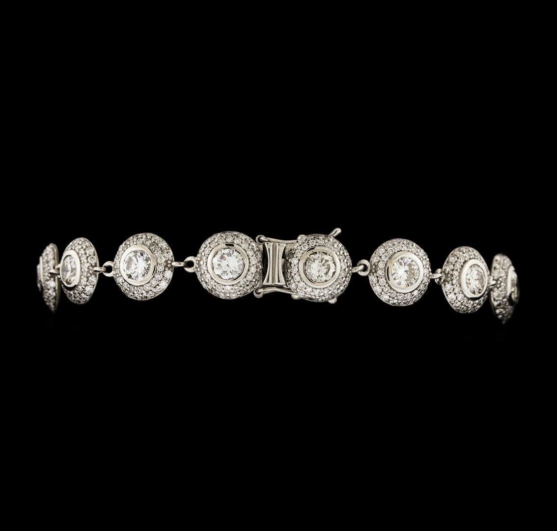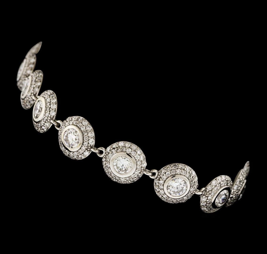 One electronically tested 14KT white gold ladies cast & assembled diamond bracelet. Seven inch length bracelet features a flexible diamond and diamond bezel ribbon, terminating in a concealed clasp with twin safeties. Bright polish finish. Identified with markings of '14K'. Condition is good. Containing: Sixteen bezel set round brilliant cut diamonds, measuring 4.20 - 4.10 x 2.49mm (depth est.) approximate total weight of 16 Stones = 4.28ct. Graded in the setting. Clarity SI-1 to SI-2. Color: G - I Five Hundred Forty-Four bead set round brilliant cut diamonds, measuring 1.30 - 1.00 x 0.69mm (depth est.) approximate total weight of 544 Stones = 3.10ct. Graded in the setting. Clarity I-1 to I-2. Color: F - H. Total Weight of Diamonds 7.38ct.. Total Weight of Bracelet 22.87gm. AIG Appraised at $24,900.00.