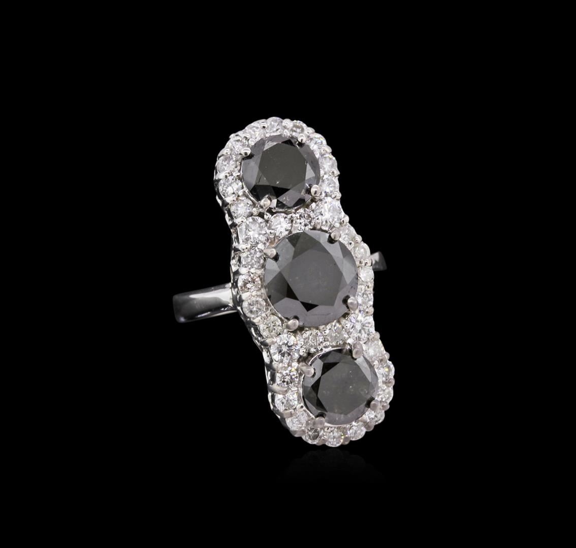 One electronically tested 14KT white gold ladies cast & assembled black and white diamond ring with a bright polish finish. Identified with markings of "K14". Condition is new, good workmanship. Containing: Three prong set round brilliant cut diamonds, measuring 8.60 - 7.02 x 4.69mm (depth est.) approximate total weight of 3 Stones = 5.85ct. Indications of multiple laboratory enhancements. Graded in the setting. Clarity Déclassé‚. Color: Fancy Black; Irradiated. Thirty-Six prong set round brilliant cut diamonds, measuring 2.70 - 2.00 x 1.41mm (depth est.) approximate total weight of 36 Stones = 1.53ct. Graded in the setting. Clarity: I-1 to I-2. Color: G - I. Total Weight of Diamonds 7.38ct. AIG Appraised at $7,250.00.