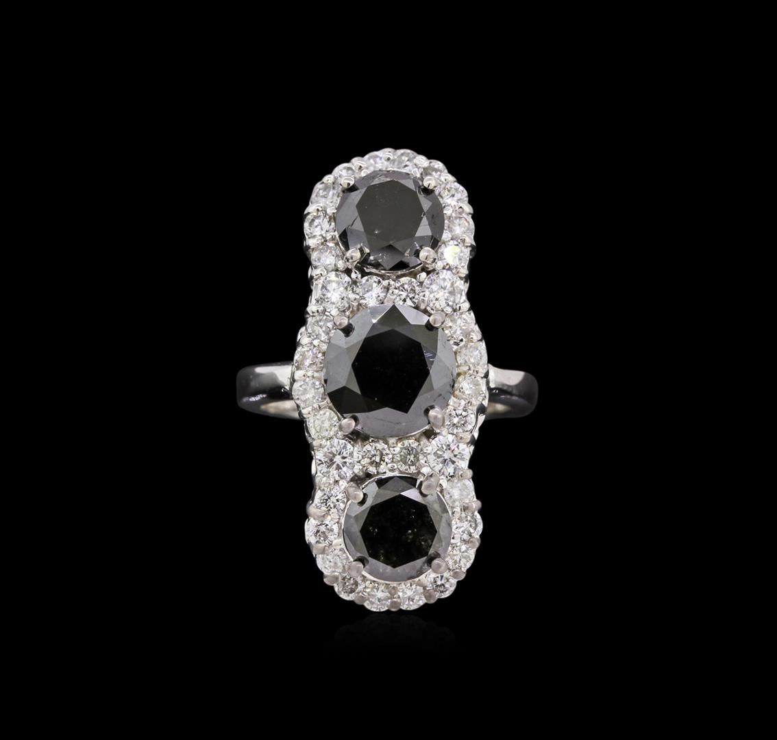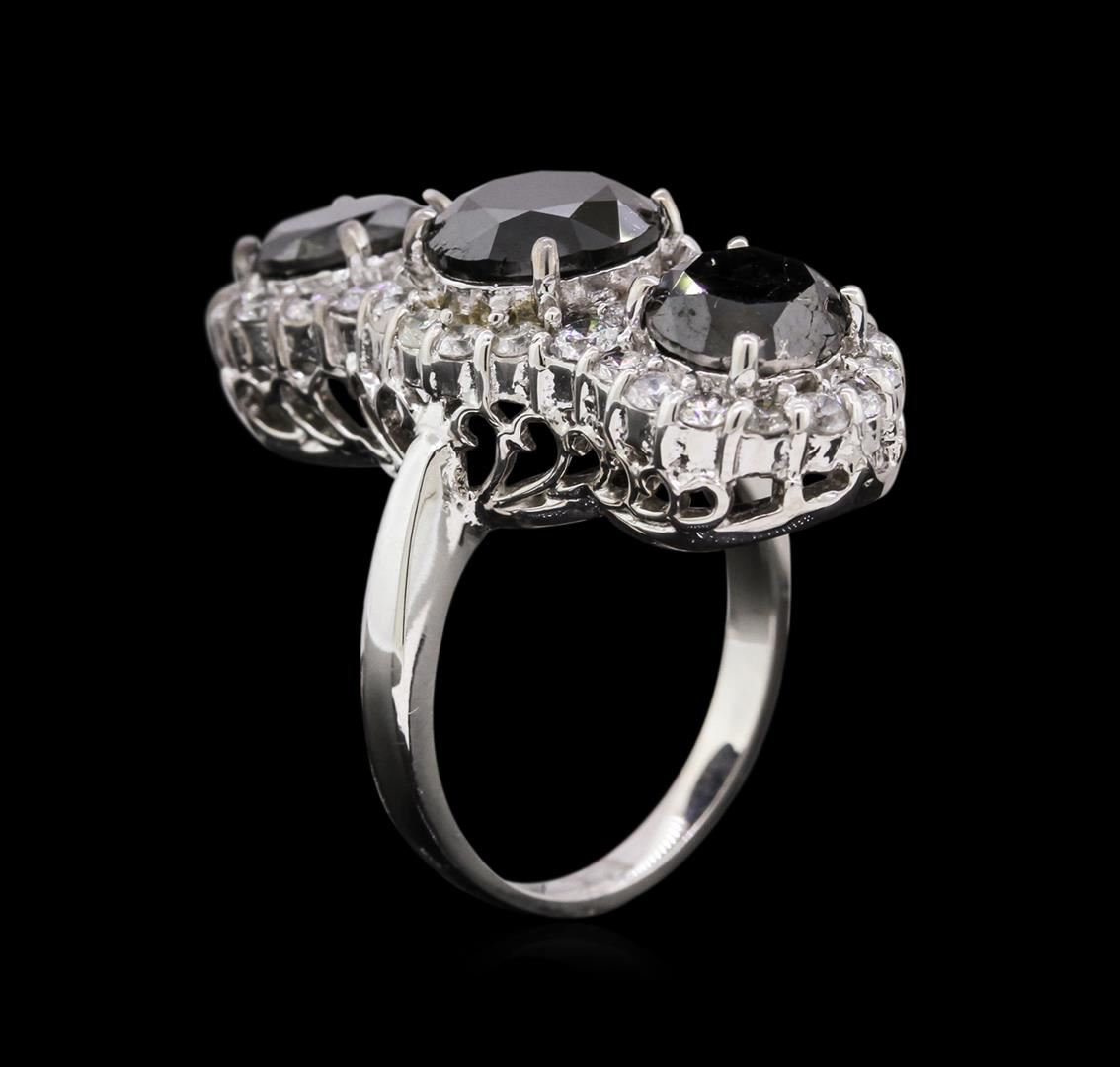 One electronically tested 14KT white gold ladies cast & assembled black and white diamond ring with a bright polish finish. Identified with markings of "K14". Condition is new, good workmanship. Containing: Three prong set round brilliant cut diamonds, measuring 8.60 - 7.02 x 4.69mm (depth est.) approximate total weight of 3 Stones = 5.85ct. Indications of multiple laboratory enhancements. Graded in the setting. Clarity Déclassé‚. Color: Fancy Black; Irradiated. Thirty-Six prong set round brilliant cut diamonds, measuring 2.70 - 2.00 x 1.41mm (depth est.) approximate total weight of 36 Stones = 1.53ct. Graded in the setting. Clarity: I-1 to I-2. Color: G - I. Total Weight of Diamonds 7.38ct. AIG Appraised at $7,250.00.