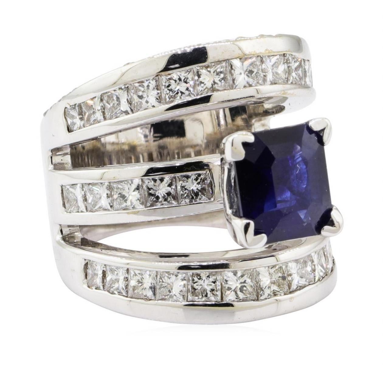 One electronically tested 18KT white gold lady's combination cast & assembled fashion ring with a three row split shank with a bright polish with milgrain detailing finish. The featured lady's ring has a shank measuring 9.00 millimeters wide. Identified with markings of '18K'. Condition is new, good workmanship. Containing: One prong set emerald standard step cut natural blue sapphire, measuring 8.71 x 7.67 x 4.40mm, (depth est.) approximate weight of 3.20 ct., clarity is heavily included, dark, strong, blue color, (GIA B 7/5), cut is very good. Transmitting light somewhat diffusely, semi-transparent to translucent. Colored gemstones are presumed to have been subjected to commonly used enhancement processes. Graded in the setting. Thirty-Six channel set princess cut diamonds, measuring 2.50 x 2.40 x 1.80mm (depth est.) approximate total weight of 36 Stones = 3.20 ct. Graded in the setting. Color H - I Clarity VS-1 to VS-2 Cut Very Good Forty-Four bead set round brilliant cut diamonds, measuring 1.90 - 1.70 x 1.12mm (depth est.) approximate total weight of 44 Stones = 1.00 ct. Graded in the setting. Color H - I Clarity VS-1 to VS-2 Cut Very Good. Total Weight of Colored Stones 3.20 ct.. Total Weight of Diamonds 4.20 ct.. Total Weight of Ring 23.20gm GAS Appraised at $13925.00. GAS Appraised.