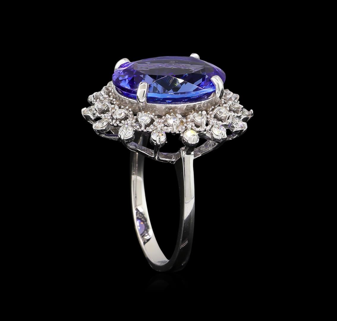 One electronically tested 14KT white gold lady's cast fashion ring with a basket double halo with a bright polish with milgrain detailing finish. The featured lady's ring has a shank measuring 2.37 millimeters wide. Identified with markings of "K14". Condition is new, good workmanship. Containing: One prong set oval modified brilliant cut natural tanzanite, measuring 14.48 x 11.54 x 6.00mm, 5%. bulge factor, approximate weight of 7.40ct., clarity is eye clean, type I, medium, moderately strong, bluish violet color, (GIA bV 5/4), cut is very good. Transmitting light with no distortion, transparent. Colored gemstones are presumed to have been subjected to commonly used enhancement processes. Graded in the setting. Fourteen prong set round brilliant cut diamonds, measuring 1.90 - 1.80 x 1.17mm (depth est.) approximate total weight of 14 Stones = 0.35ct. Graded in the setting. Clarity: SI-1 to SI-2. Color: H - I. Cut Very Good Fourteen prong set round brilliant cut diamonds, measuring 1.60 - 1.50 x 0.98mm (depth est.) approximate total weight of 14 Stones = 0.21ct. Graded in the setting. Clarity: SI-1 to SI-2. Color: H - I. Cut Good. Total Weight of Colored Stones 7.40ct. Total Weight of Diamonds 0.56ct. Total Weight of Ring 6.40gm. GAS Appraised at $13,640.00.