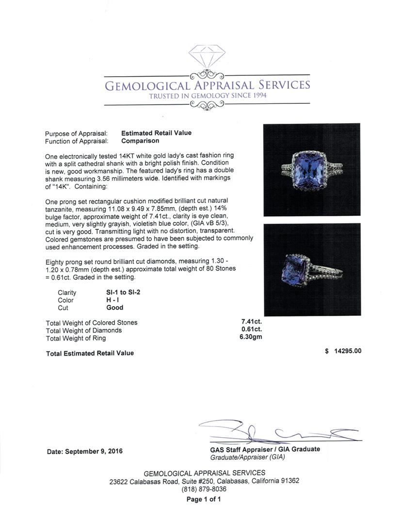 One electronically tested 14KT white gold lady's cast fashion ring with a split cathedral shank with a bright polish finish. The featured lady's ring has a double shank measuring 3.56 millimeters wide. Identified with markings of '14K'. Condition is new, good workmanship. Containing: One prong set rectangular cushion modified brilliant cut natural tanzanite, measuring 11.08 x 9.49 x 7.85mm, (depth est.) 14%. bulge factor, approximate weight of 7.41ct., clarity is eye clean, medium, very slightly grayish, violetish blue color, (GIA vB 5/3), cut is very good. Transmitting light with no distortion, transparent. Colored gemstones are presumed to have been subjected to commonly used enhancement processes. Graded in the setting. Eighty prong set round brilliant cut diamonds, measuring 1.30 - 1.20 x 0.78mm (depth est.) approximate total weight of 80 Stones = 0.61ct. Graded in the setting. Clarity SI-1 to SI-2. Color: H - I Cut Good. Total Weight of Colored Stones 7.41ct.. Total Weight of Diamonds 0.61ct.. Total Weight of Ring 6.30gm GAS Appraised at $14,295.00.