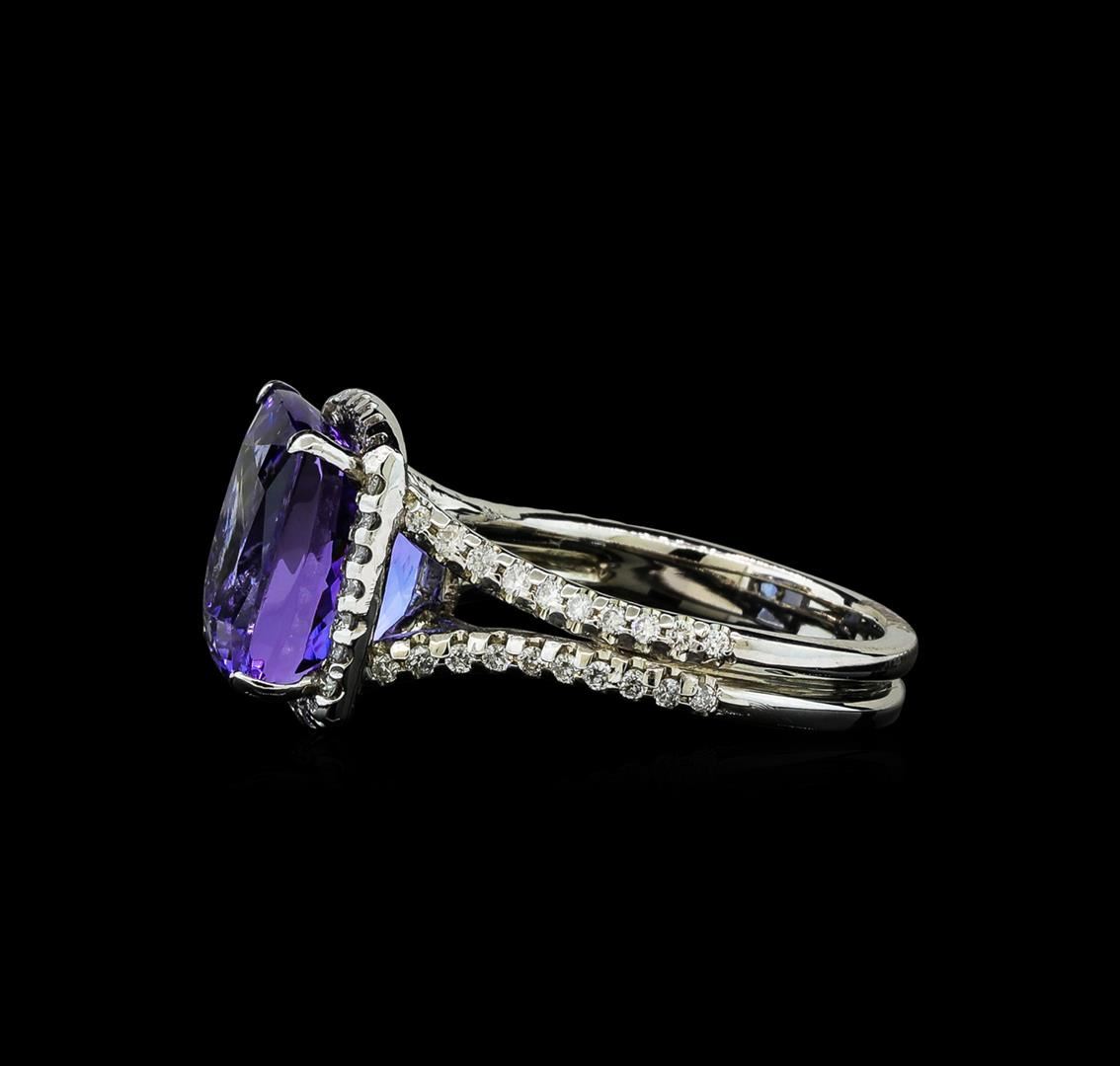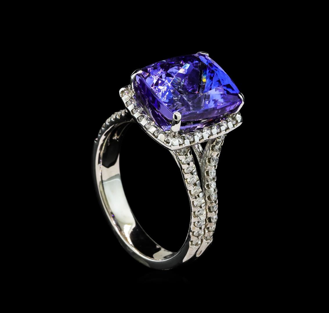 One electronically tested 14KT white gold lady's cast fashion ring with a split cathedral shank with a bright polish finish. The featured lady's ring has a double shank measuring 3.56 millimeters wide. Identified with markings of '14K'. Condition is new, good workmanship. Containing: One prong set rectangular cushion modified brilliant cut natural tanzanite, measuring 11.08 x 9.49 x 7.85mm, (depth est.) 14%. bulge factor, approximate weight of 7.41ct., clarity is eye clean, medium, very slightly grayish, violetish blue color, (GIA vB 5/3), cut is very good. Transmitting light with no distortion, transparent. Colored gemstones are presumed to have been subjected to commonly used enhancement processes. Graded in the setting. Eighty prong set round brilliant cut diamonds, measuring 1.30 - 1.20 x 0.78mm (depth est.) approximate total weight of 80 Stones = 0.61ct. Graded in the setting. Clarity SI-1 to SI-2. Color: H - I Cut Good. Total Weight of Colored Stones 7.41ct.. Total Weight of Diamonds 0.61ct.. Total Weight of Ring 6.30gm GAS Appraised at $14,295.00.