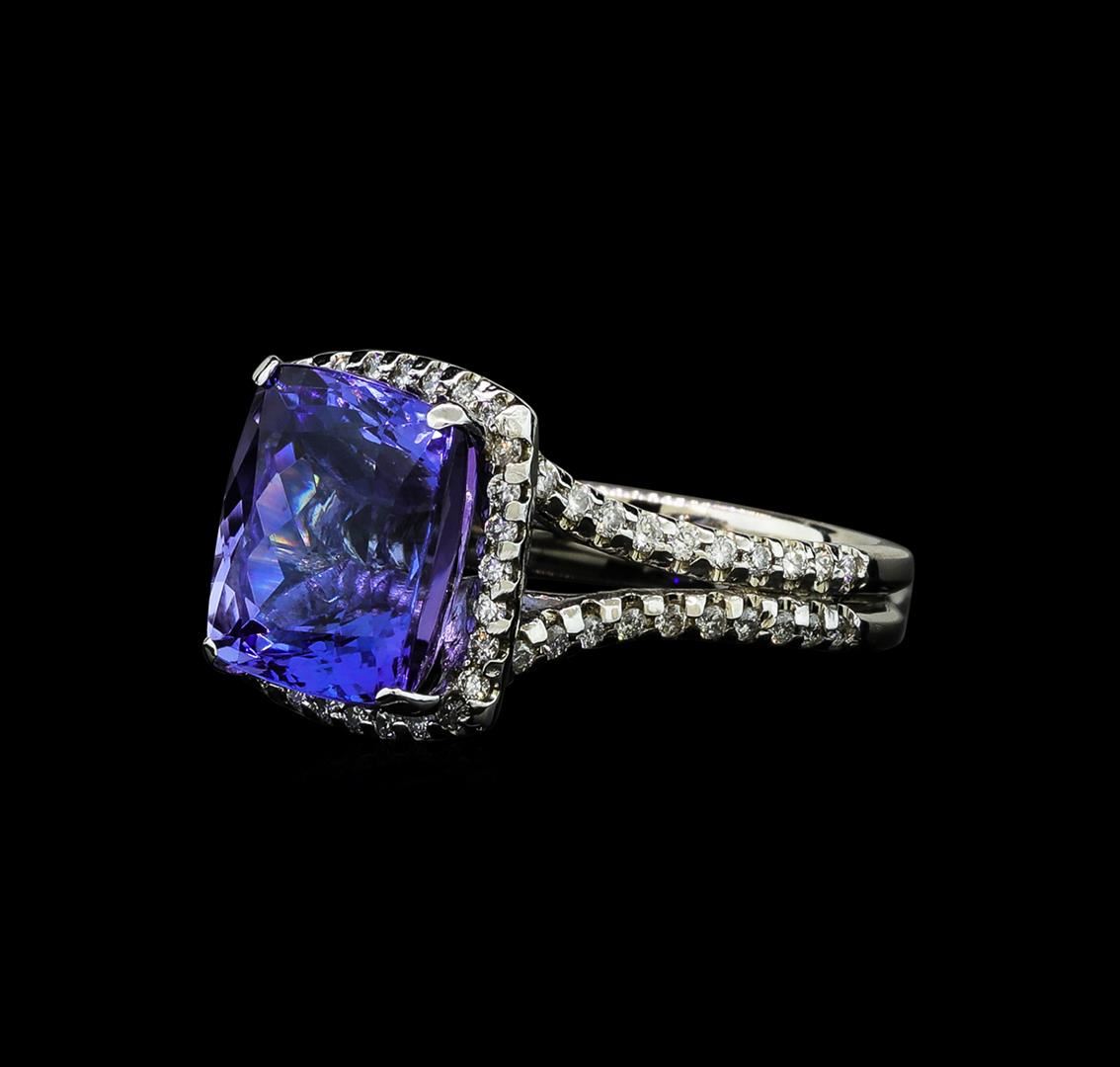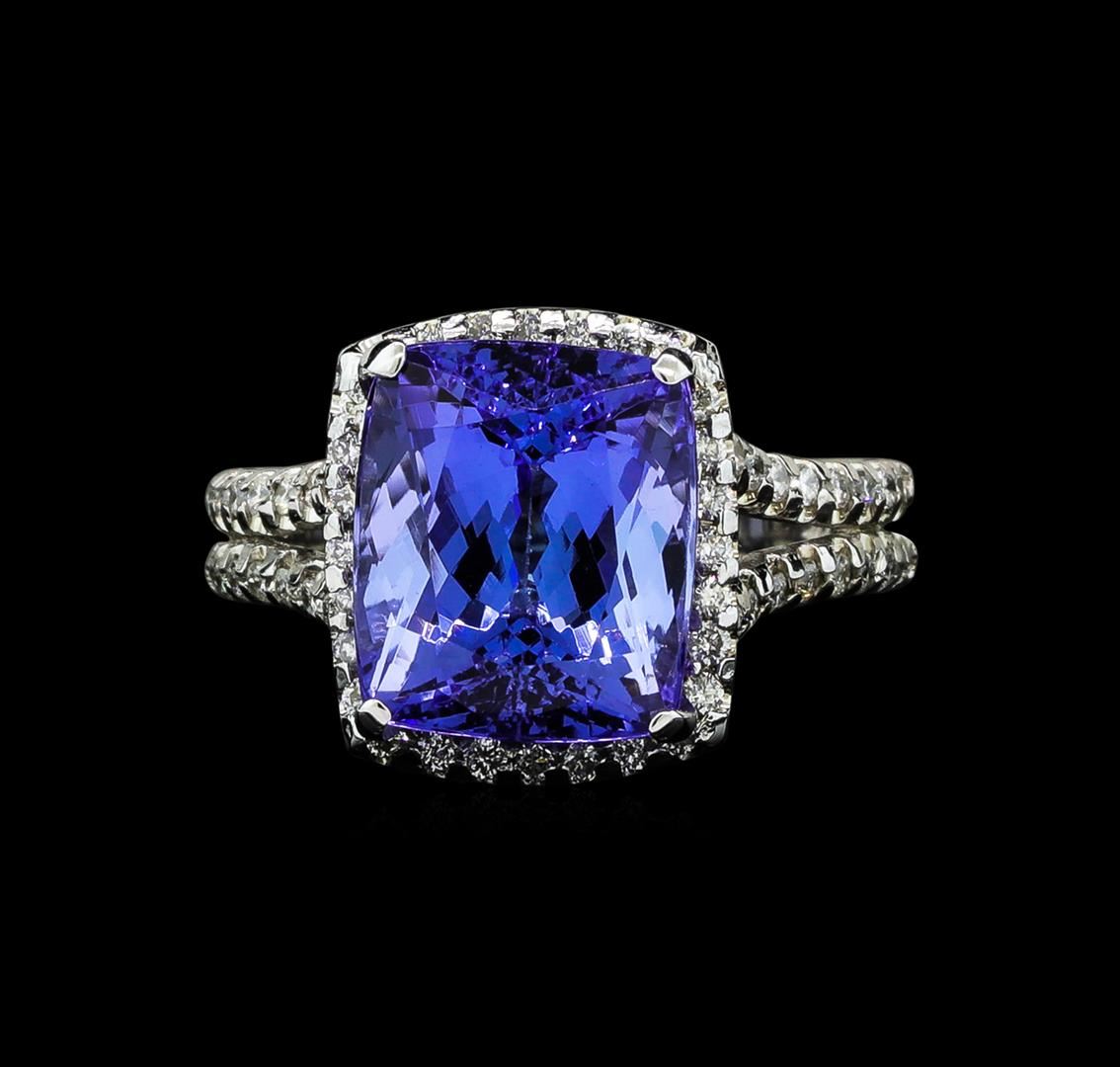 One electronically tested 14KT white gold lady's cast fashion ring with a split cathedral shank with a bright polish finish. The featured lady's ring has a double shank measuring 3.56 millimeters wide. Identified with markings of '14K'. Condition is new, good workmanship. Containing: One prong set rectangular cushion modified brilliant cut natural tanzanite, measuring 11.08 x 9.49 x 7.85mm, (depth est.) 14%. bulge factor, approximate weight of 7.41ct., clarity is eye clean, medium, very slightly grayish, violetish blue color, (GIA vB 5/3), cut is very good. Transmitting light with no distortion, transparent. Colored gemstones are presumed to have been subjected to commonly used enhancement processes. Graded in the setting. Eighty prong set round brilliant cut diamonds, measuring 1.30 - 1.20 x 0.78mm (depth est.) approximate total weight of 80 Stones = 0.61ct. Graded in the setting. Clarity SI-1 to SI-2. Color: H - I Cut Good. Total Weight of Colored Stones 7.41ct.. Total Weight of Diamonds 0.61ct.. Total Weight of Ring 6.30gm GAS Appraised at $14,295.00.