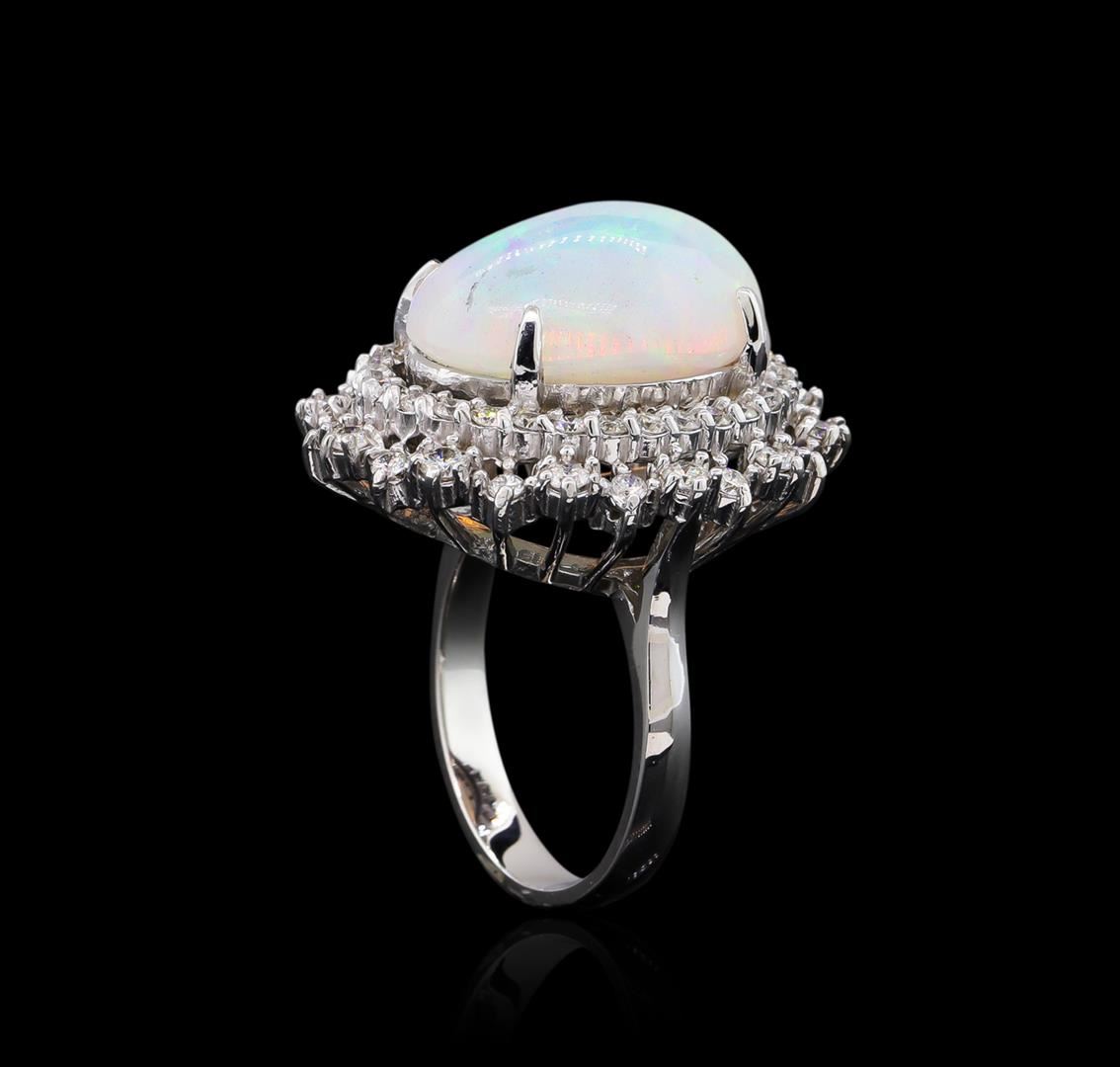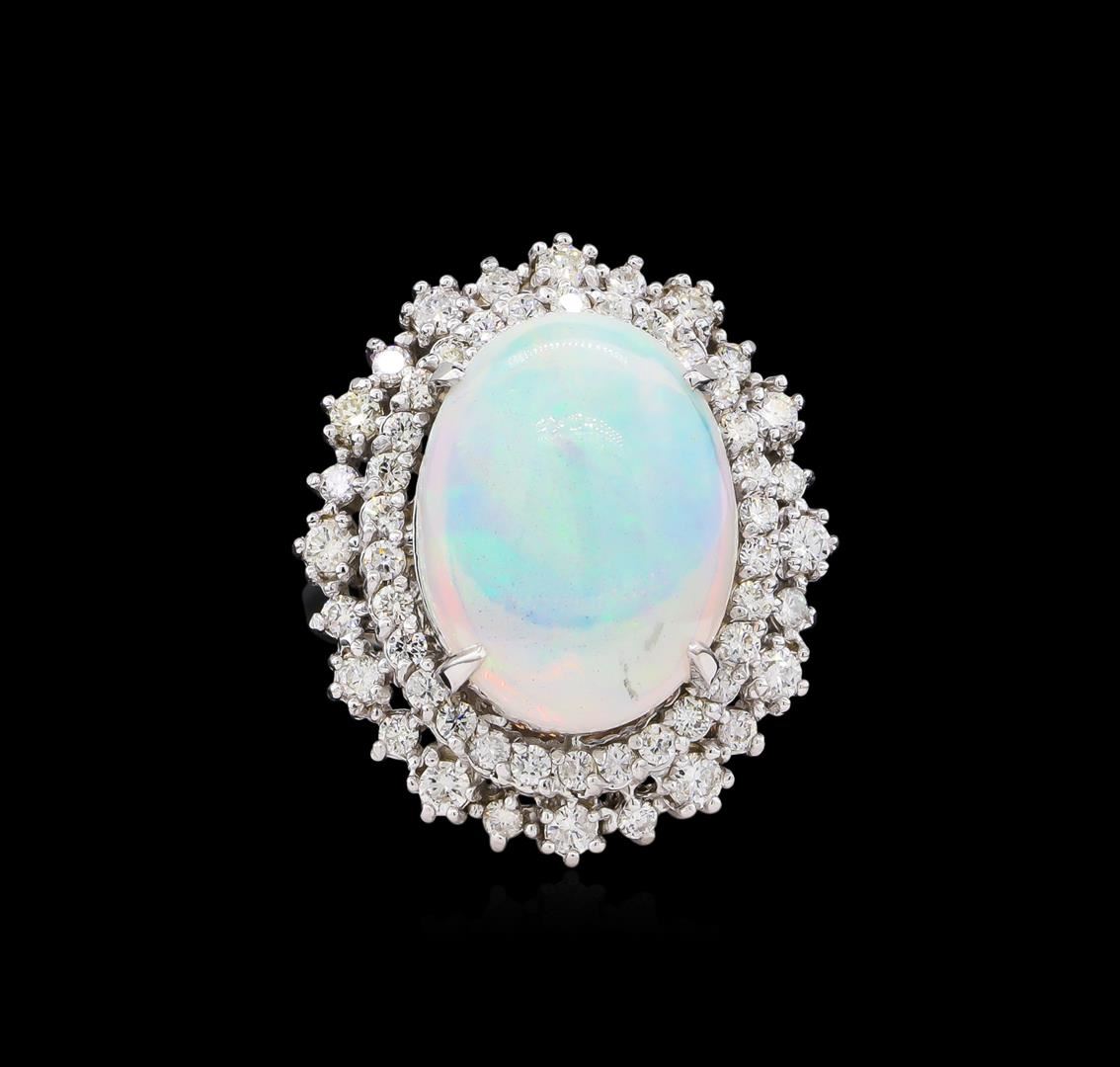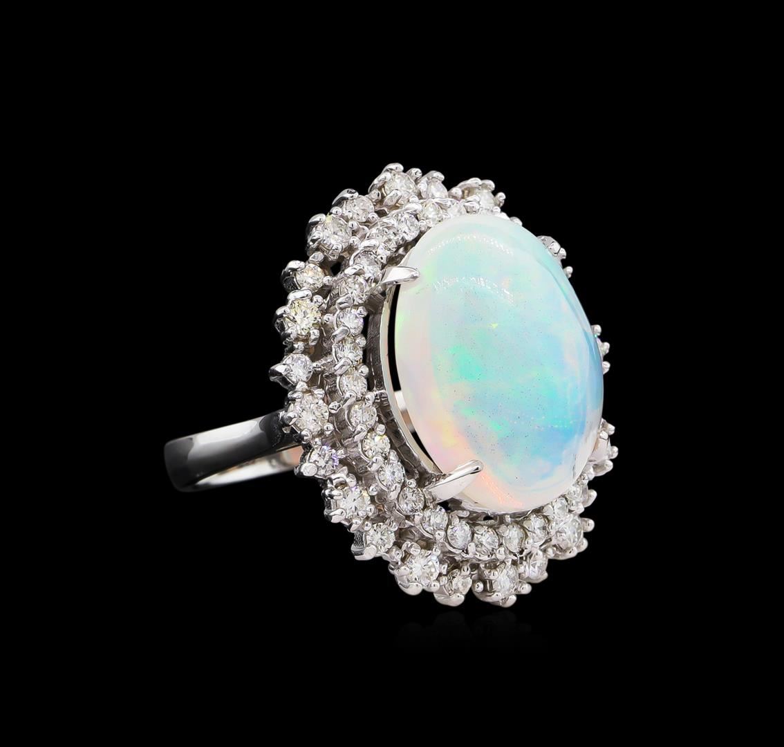 One electronically tested 14KT white gold lady's cast fashion ring with a double basket halo with a bright polish finish. The featured lady's ring has a shank measuring 3.01 millimeters wide. Identified with markings of "K14". Condition is new, good workmanship. Containing: One crystal opal that is cut in a oval shaped cabochon and is prong set, measuring 16.79 mm long x 12.78 mm wide, and 9.20 mm thick and the approximate weight is 7.42 carats. The opal has a brilliant, red-blue multicolor play of color (fire) in a rolling flashfire pattern; a medium dome; a good cut; no inclusions; consistent in its brightness and pattern; and is not directional. Twelve prong set round brilliant cut diamonds, measuring 2.10 - 2.00 x 1.27mm (depth est.) approximate total weight of 12 Stones = 0.40ct. Graded in the setting. Clarity: SI-1 to I-1. Color: H - I. Cut Good Forty-Two prong set round brilliant cut diamonds, measuring 1.70 - 1.60 x 1.02mm (depth est.) approximate total weight of 42 Stones = 0.73ct. Graded in the setting. Clarity: SI-1 to SI-2. Color: H - I. Cut Good. Total Weight of Diamonds 1.13ct. Total Weight of Opals 7.42ct. Total Weight of Ring 10.00gm GAS Appraised.