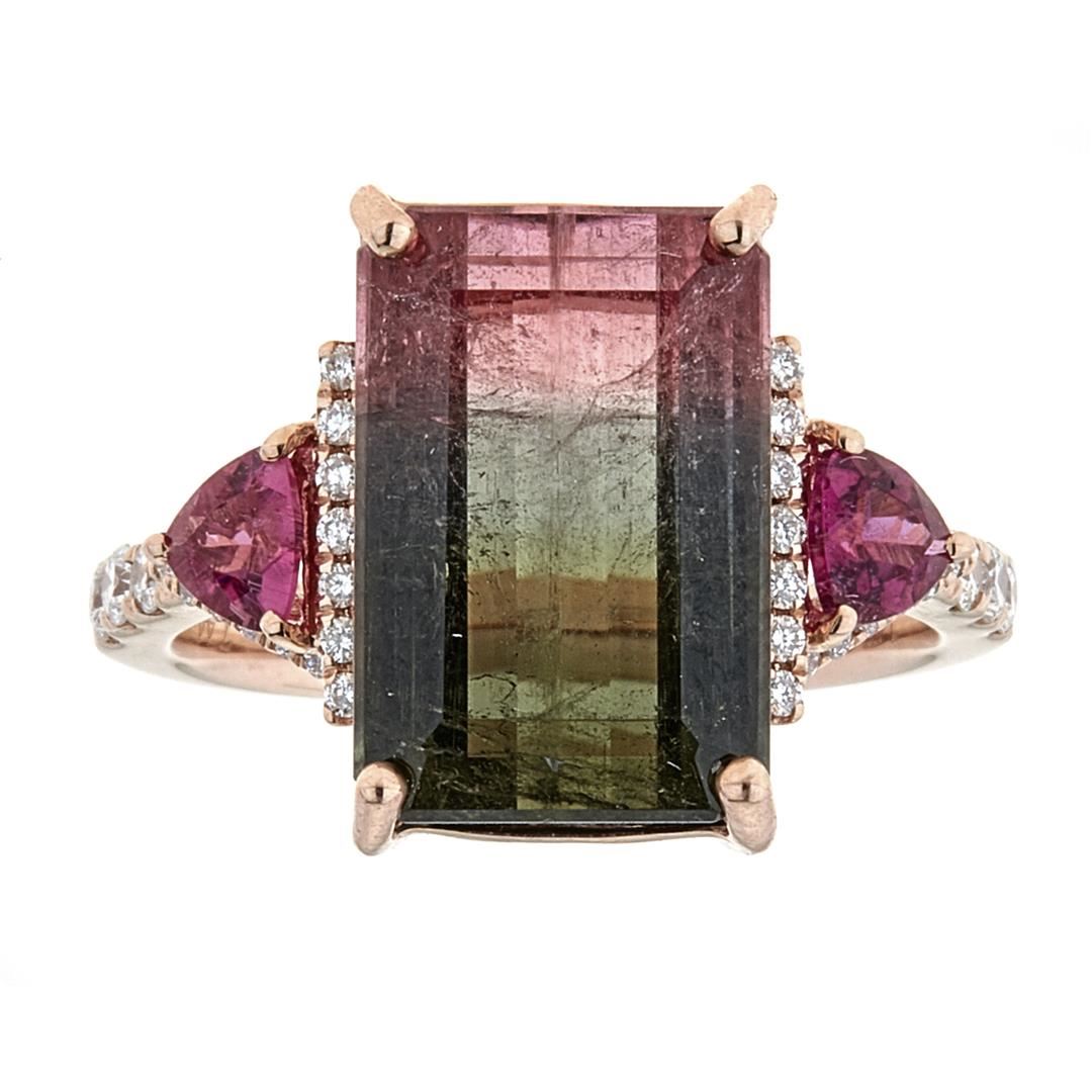 One Lady's watermelon tourmaline, rubellite and diamond ring. Setting: 14kt rose gold mounting. Additional: 2 trillion rubellite tourmalines = 0.45+ cts. Twt (reddish pink/transparent) and 42 round diamonds =.30 cts. TWT (G-H/VS-SI). Center gem stone information: Species: natural tourmaline. Variety: watermelon tourmaline. Shape and cut: emerald cut. Measurements: 13.81x9.25x5.99mm. Weight: 7.44 carats. Transparency: transparent. Color hue: pink/green(bi-color). Saturation: moderate to strong. Total Weight: 3.95 grams.