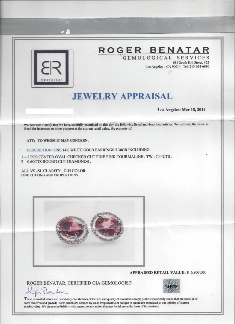 One pair of 14KT white gold earrings weighing 5.30 grams including: 2 center oval checker cut fine pink tourmaline with a total weight of 7.44ct and round cut diamonds with a total weight of 0.60ct. All VS-SI clarity, G-H color. Fine cutting and proportions. RBGS Appraised at $6,903.00.