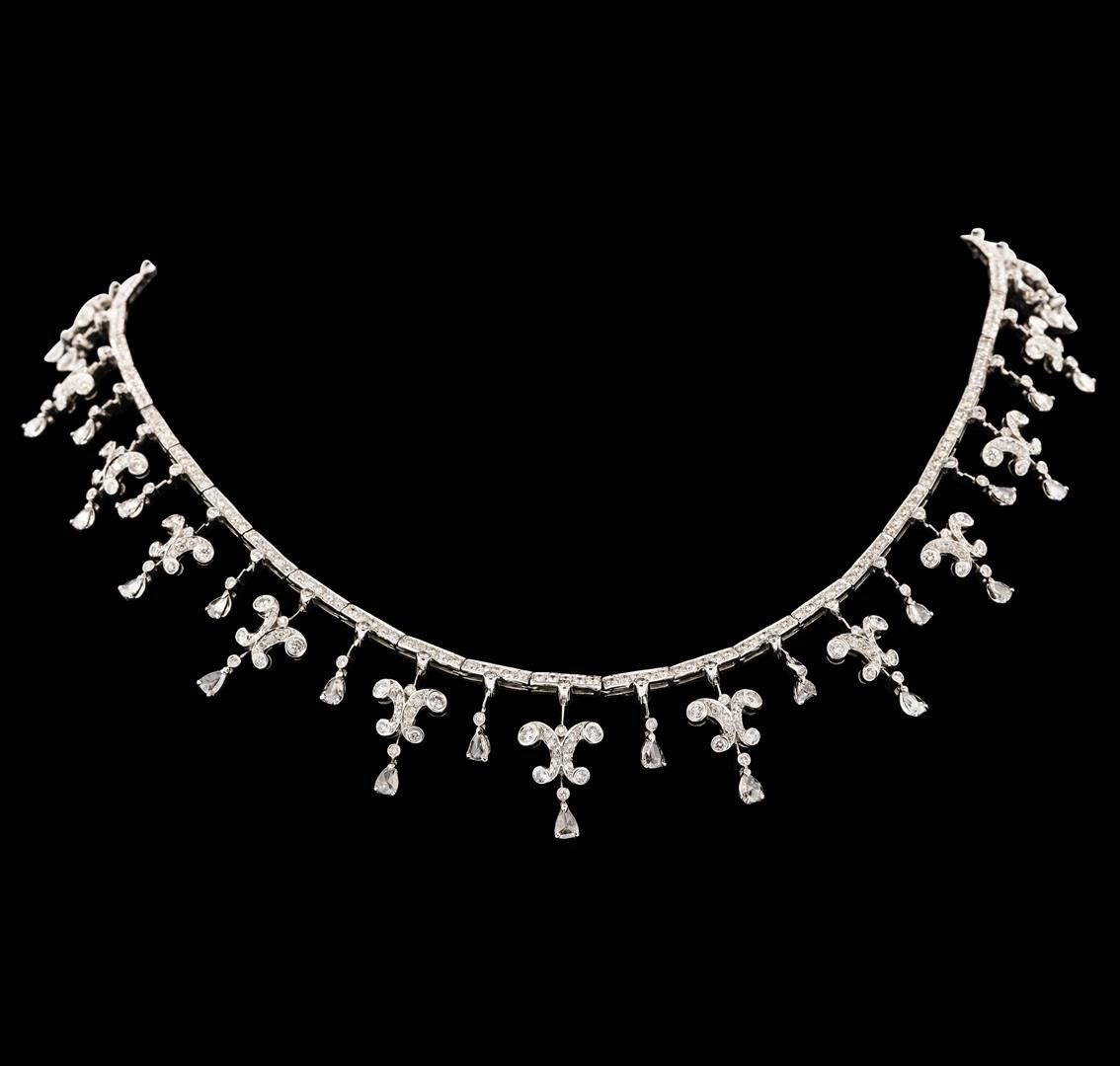 One electronically tested 18KT white gold lady's combination cast & assembled fashion necklace with a tongue clasp with foldover safety with a bright polish finish. The featured lady's necklace has connected 10mm long bar links measuring approximately 16.5 inches in total length. The necklace features alternating dangling drop diamonds. Identified with markings of '18K 750'. Condition is like new, good workmanship. Containing: Twenty-Seven prong set pear shaped cut diamonds, measuring 3.95 x 2.70 x 0.90mm (depth est.) approximate total weight of 27 Stones = 1.55ct. The featured pear shaped diamonds are rose cut. Graded in the setting. Color G - I Clarity VS-2 to SI-2 Cut Good Twenty-Six bezel set round brilliant cut diamonds, measuring 2.20 - 2.10 x 1.33mm (depth est.) approximate total weight of 26 Stones = 1.00ct. Graded in the setting. Color H - I Clarity SI-1 to SI-2 Cut Very Good One Hundred Sixty-One prong set round brilliant cut diamonds, measuring 1.90 - 1.80 x 1.15mm (depth est.) approximate total weight of 161 Stones = 3.90ct. Graded in the setting. Color H - I Clarity SI-1 to I-1 Cut Good One Hundred Thirty-One prong set round brilliant cut diamonds, measuring 1.40 - 1.10 x 0.78mm (depth est.) approximate total weight of 131 Stones = 1.00ct. Graded in the setting. Color H - I Clarity SI-1 to I-1 Cut Good. Total Weight of Diamonds 7.45ct.. Total Weight of Necklace 41.80gm GAS Appraised at $23,275.00.