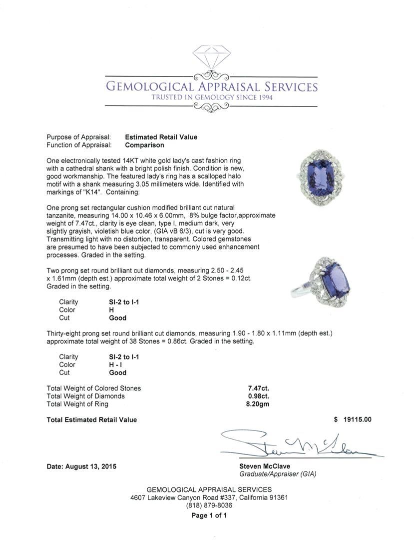 One electronically tested 14KT white gold lady's cast fashion ring with a cathedral shank with a bright polish finish. The featured lady's ring has a scalloped halo motif with a shank measuring 3.05 millimeters wide. Identified with markings of "K14". Condition is new, good workmanship. Containing: One prong set rectangular cushion modified brilliant cut natural tanzanite, measuring 14.00 x 10.46 x 6.00mm, 8% bulge factor, approximate weight of 7.47ct., clarity is eye clean, type I, medium dark, very slightly grayish, violetish blue color, (GIA vB 6/3), cut is very good. Transmitting light with no distortion, transparent. Colored gemstones are presumed to have been subjected to commonly used enhancement processes. Graded in the setting. Two prong set round brilliant cut diamonds, measuring 2.50 - 2.45 x 1.61mm (depth est.) approximate total weight of 2 Stones = 0.12ct. Graded in the setting. Clarity: SI-2 to I-1. Color: Good Thirty-Eight prong set round brilliant cut diamonds, measuring 1.90 - 1.80 x 1.11mm (depth est.) approximate total weight of 38 Stones = 0.86ct. Graded in the setting. Clarity: SI-2 to I-1. Color: H - I. Cut Good. Total Weight of Colored Stones 7.47ct. Total Weight of Diamonds 0.98ct. Total Weight of Ring 8.20gm. GAS Appraised at $19,115.00.