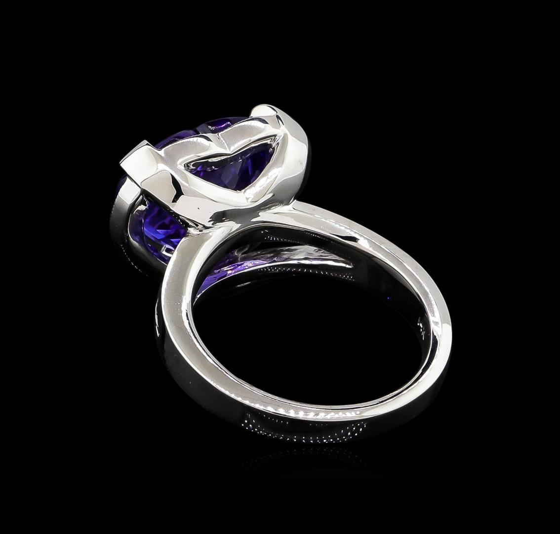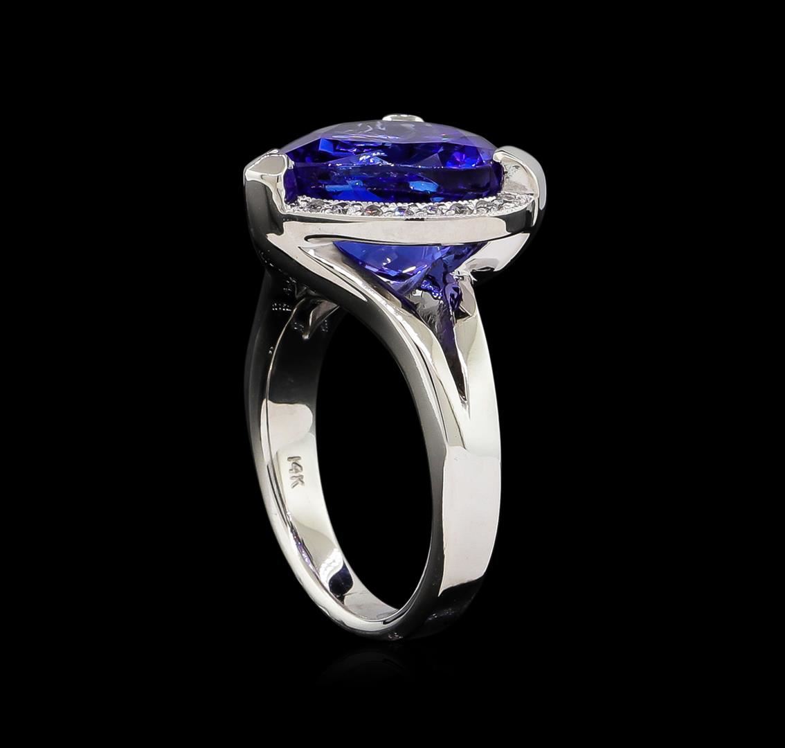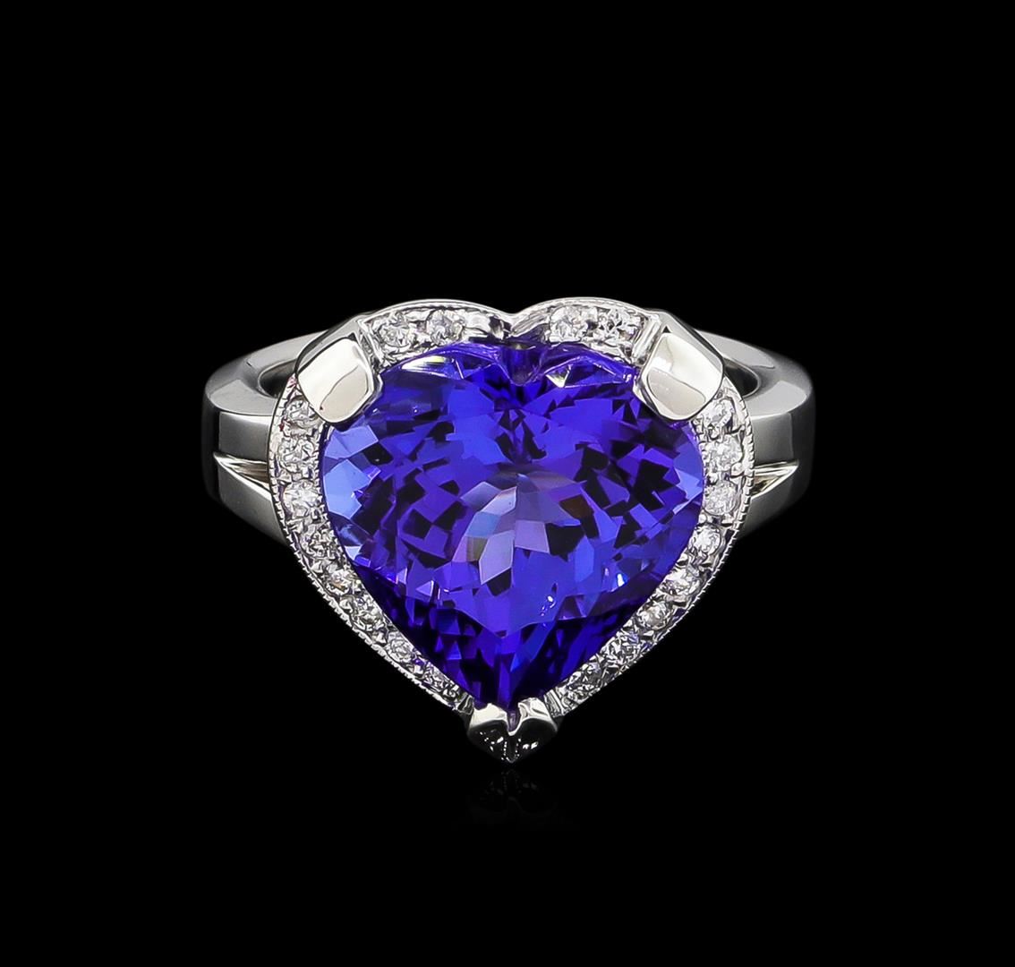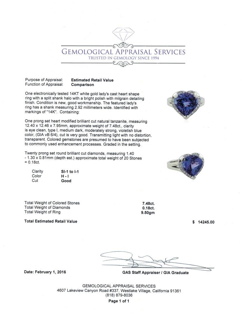 One electronically tested 14KT white gold lady's cast heart shape ring with a split shank halo with a bright polish with milgrain detailing finish. The featured lady's ring has a shank measuring 2.92 millimeters wide. Identified with markings of "14K". Condition is new, good workmanship. Containing: One prong set heart modified brilliant cut natural tanzanite, measuring 12.40 x 12.46 x 7.95mm, approximate weight of 7.48ct., clarity is eye clean, type I, medium dark, moderately strong, violetish blue color, (GIA vB 6/4), cut is very good. Transmitting light with no distortion, transparent. Colored gemstones are presumed to have been subjected to commonly used enhancement processes. Graded in the setting. Twenty prong set round brilliant cut diamonds, measuring 1.40 - 1.30 x 0.81mm (depth est.) approximate total weight of 20 Stones = 0.18ct. Clarity: SI-1 to I-1. Color: H - I. Cut Good. Total Weight of Colored Stones 7.48ct. Total Weight of Diamonds 0.18ct. Total Weight of Ring 9.50gm. GAS Appraised at $14,245.00.