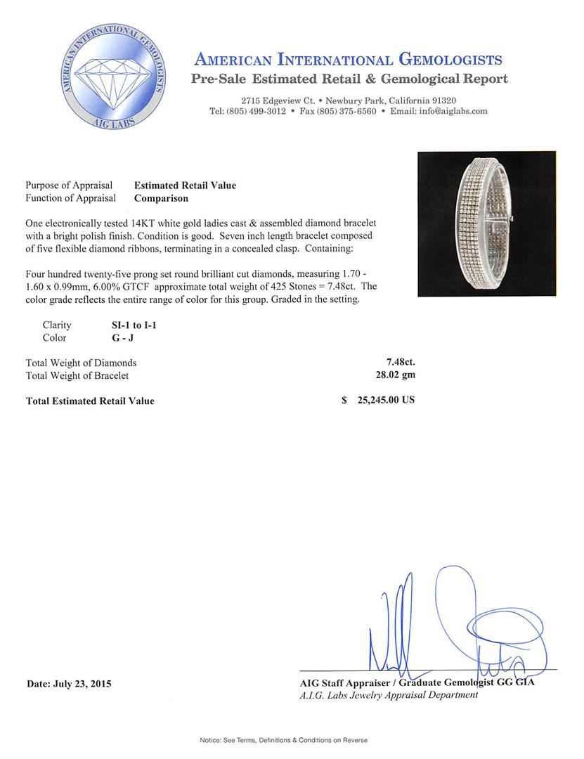 One electronically tested 14KT white gold ladies cast & assembled diamond bracelet with a bright polish finish. Seven inch length bracelet composed of five flexible diamond ribbons, terminating in a concealed clasp. Condition is good. Containing: Four Hundred Twenty-Five prong set round brilliant cut diamonds, measuring 1.70 - 1.60 x 0.99mm, 6.00.%. GTCF approximate. Total Weight of 425 Stones = 7.48ct. The color grade reflects the entire range of color for this group. Graded in the setting. Clarity: SI-1 to I-1. Color: G - J. Total Weight of Diamonds 7.48ct. Total Weight of Bracelet 28.02gm. AIG Appraised at $25,245.00.