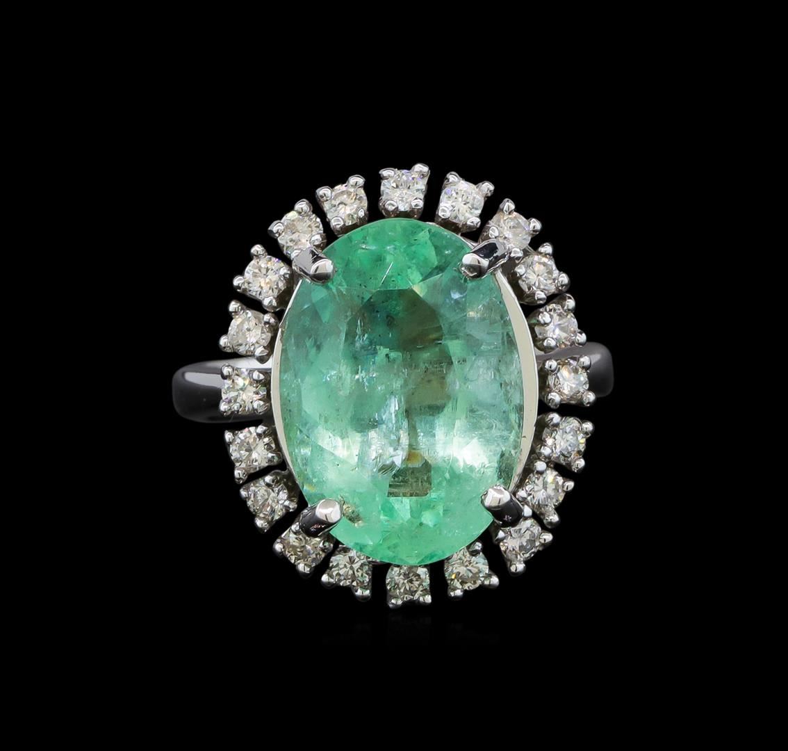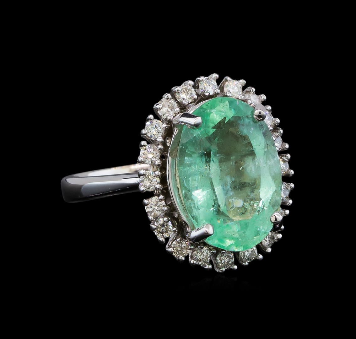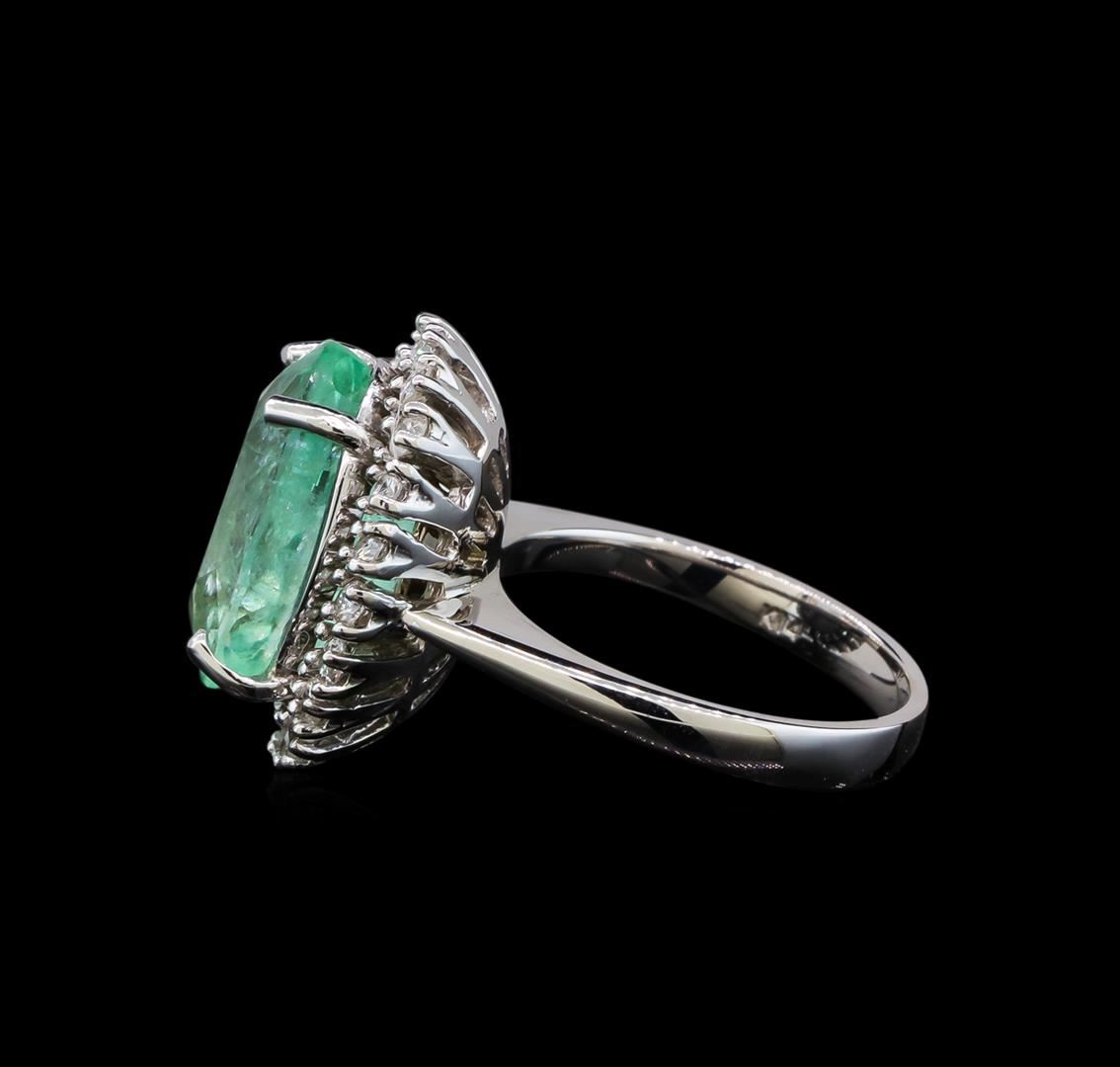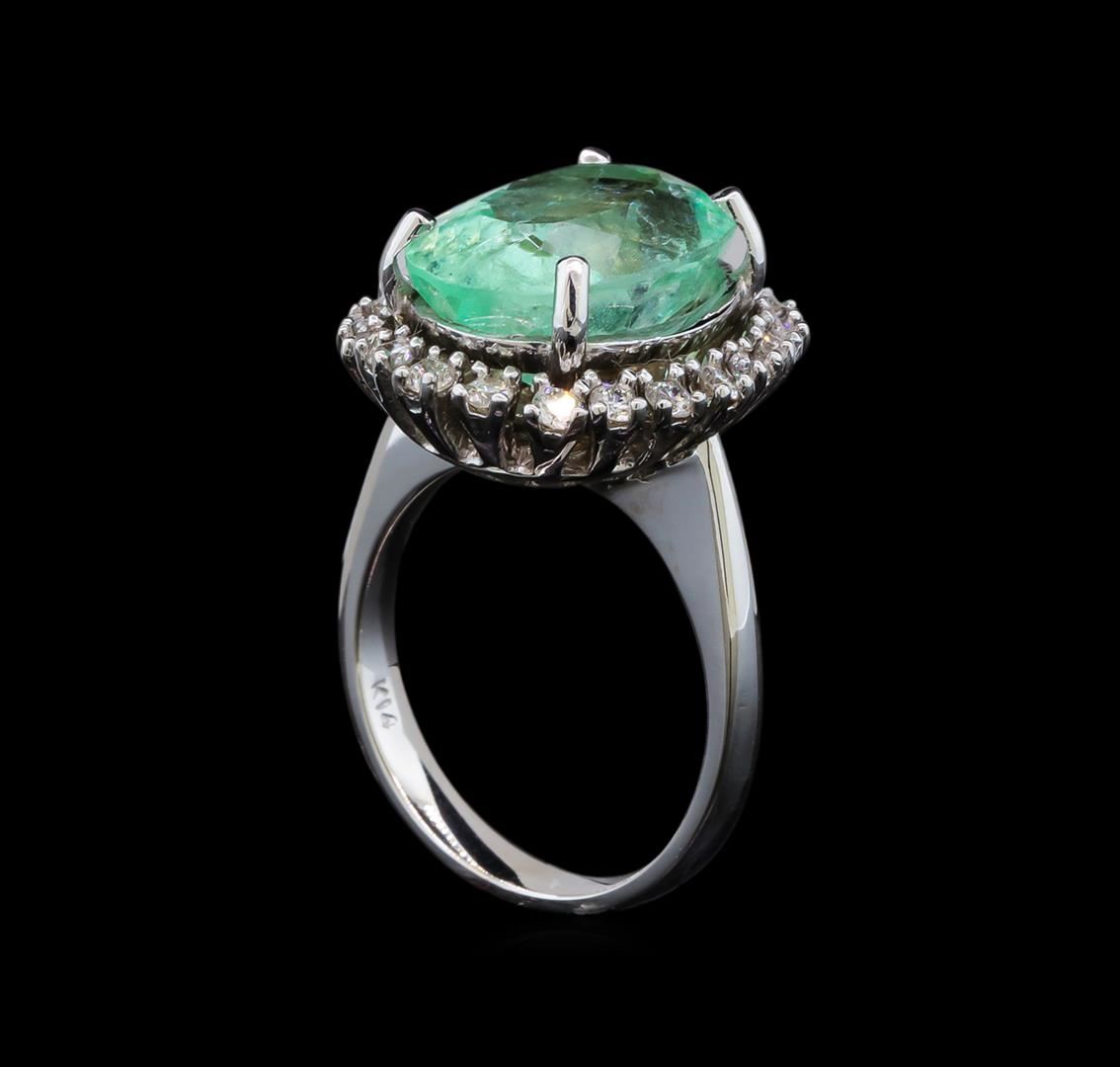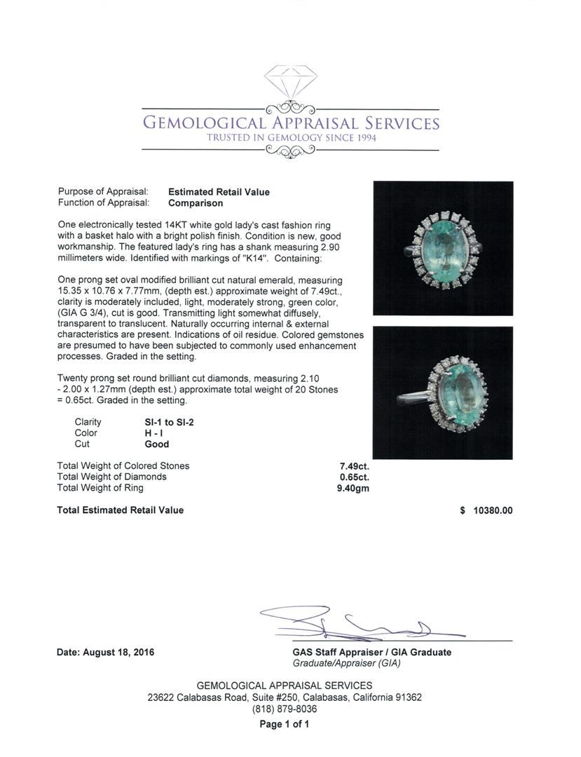 One electronically tested 14KT white gold lady's cast fashion ring with a basket halo with a bright polish finish. The featured lady's ring has a shank measuring 2.90 millimeters wide. Identified with markings of 'K14'. Condition is new, good workmanship. Containing: One prong set oval modified brilliant cut natural emerald, measuring 15.35 x 10.76 x 7.77mm, (depth est.) approximate weight of 7.49ct., clarity is moderately included, light, moderately strong, green color, (GIA G 3/4), cut is good. Transmitting light somewhat diffusely, transparent to translucent. Naturally occurring internal & external characteristics are present. Indications of oil residue. Colored gemstones are presumed to have been subjected to commonly used enhancement processes. Graded in the setting. Twenty prong set round brilliant cut diamonds, measuring 2.10 - 2.00 x 1.27mm (depth est.) approximate total weight of 20 Stones = 0.65ct. Graded in the setting. Clarity SI-1 to SI-2. Color: H - I Cut Good. Total Weight of Colored Stones 7.49ct.. Total Weight of Diamonds 0.65ct.. Total Weight of Ring 9.40gm. GAS Appraised at $10,380.00.