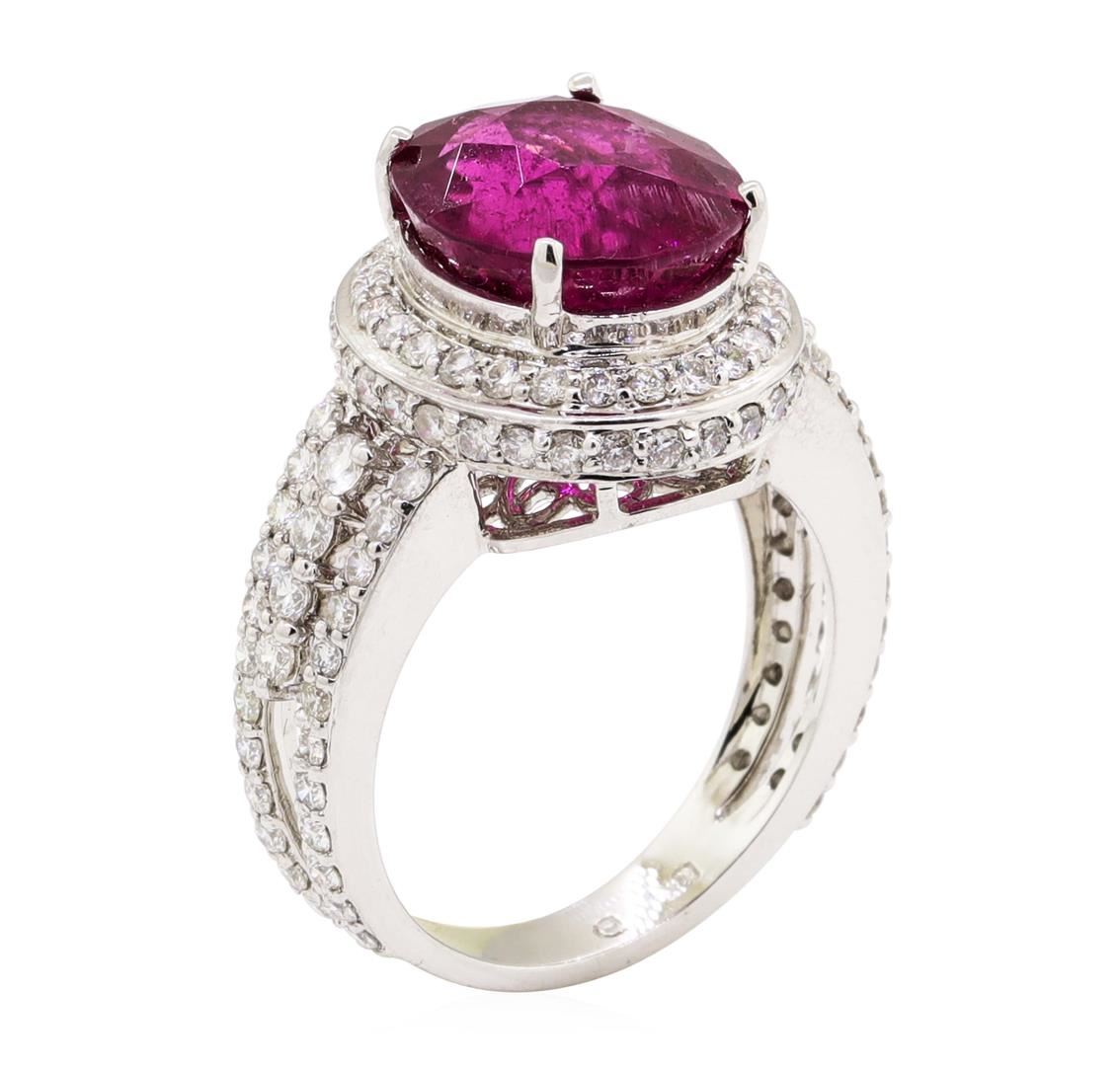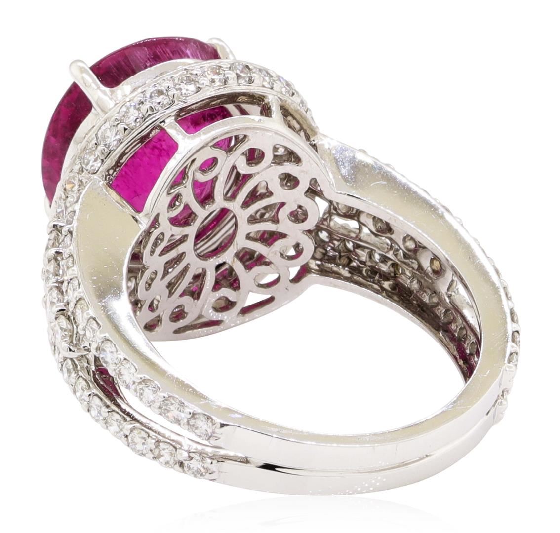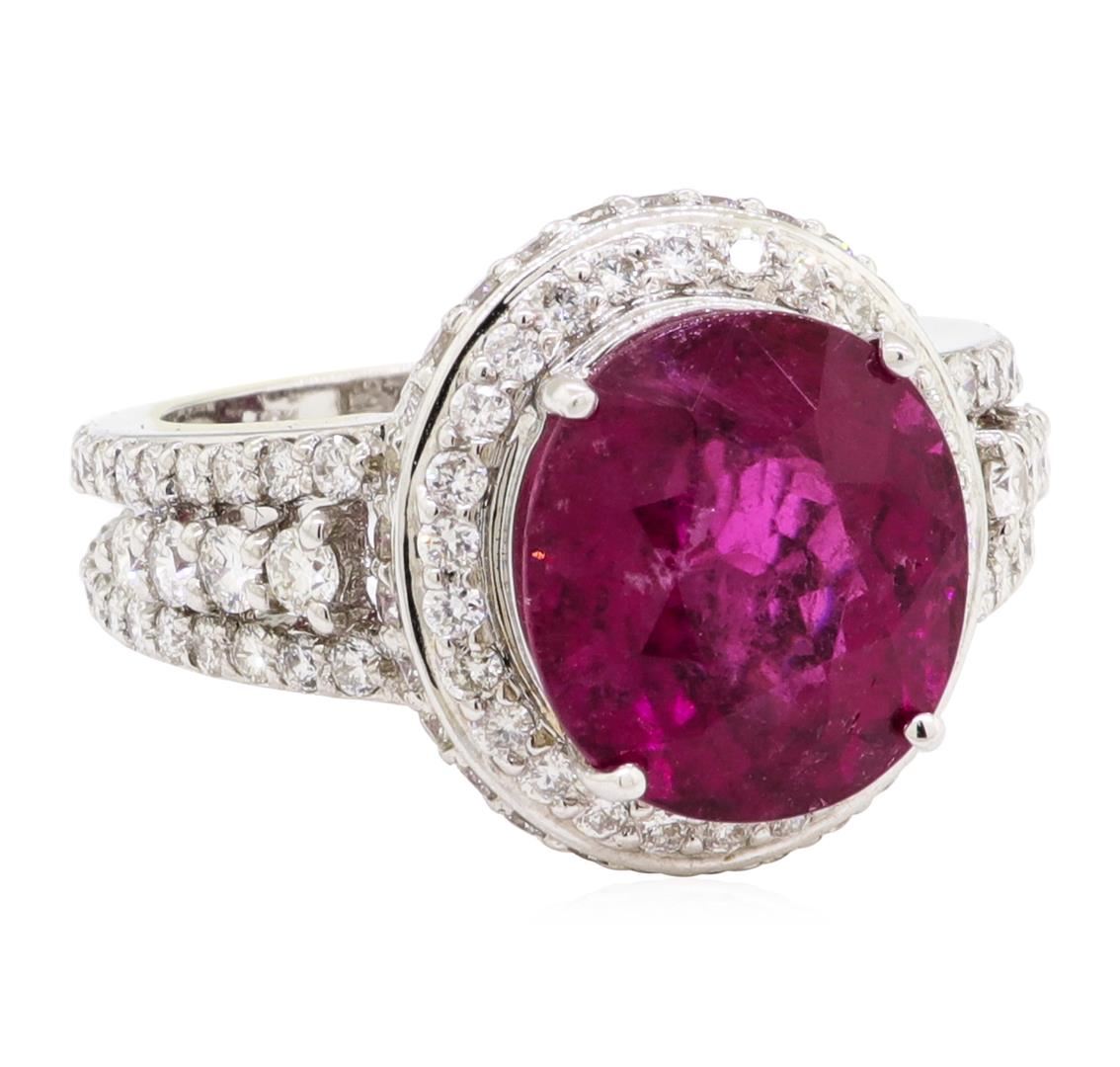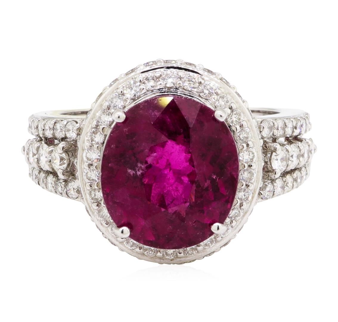 One electronically tested 18KT white gold lady's cast fashion ring with a double halo with a bright polish finish. The featured lady's ring has a double shank measuring 3.35 millimeters wide. Identified with markings of '18K'. Condition is new, good workmanship. Containing: One prong set oval modified mixed cut natural rubellite, measuring 11.84 x 10.62 x 7.47mm, (depth est.) approximate weight of 5.99ct., clarity is heavily included, medium dark, moderately strong, slightly purplish red color, (GIA slpR 6/4), cut is good. Transmitting light somewhat diffusely, semi-transparent to translucent. Colored gemstones are presumed to have been subjected to commonly used enhancement processes. Graded in the setting. Eight prong set round brilliant cut diamonds, measuring 2.25 - 2.20 x 1.34mm (depth est.) approximate total weight of 8 Stones = 0.32ct. Graded in the setting. Color H - I Clarity SI-1 to SI-2 Cut Good One Hundred Four prong set round brilliant cut diamonds, measuring 1.50 - 1.40 x 0.90mm (depth est.) approximate total weight of 104 Stones = 1.18ct. Graded in the setting. Color H - I Clarity SI-1 to SI-2 Cut Good. Total Weight of Colored Stones 5.99ct.. Total Weight of Diamonds 1.50ct.. Total Weight of Ring 8.40gm GAS Appraised at $9750.00. GAS Appraised.