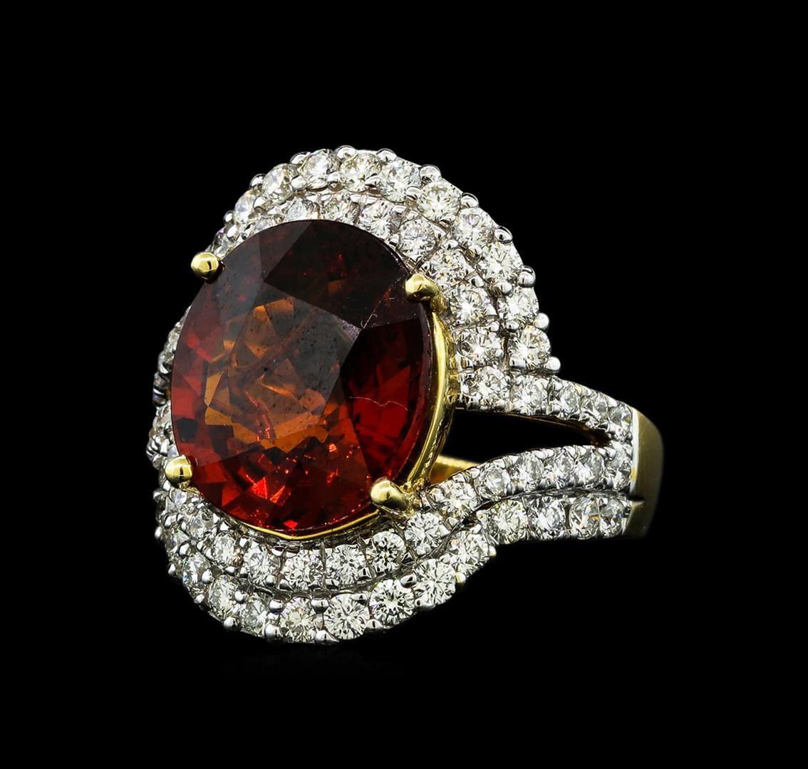 One electronically tested 14KT yellow gold lady's combination cast & assembled fashion ring with a split bypass shank with a bright polish finish. The featured lady's ring has a shank measuring 2.30 millimeters wide. Identified with markings of '14K'. Condition is new, good workmanship. Containing: One prong set oval modified mixed cut natural malaya garnet, measuring 12.93 x 11.52 x 5.68mm, (depth est.) 10%. bulge factor, approximate weight of 7.50ct., clarity is eye clean, medium dark, strong, reddish orange color, (GIA rO 6/5), cut is good. Transmitting light with no distortion, transparent. Colored gemstones are presumed to have been subjected to commonly used enhancement processes. Graded in the setting. Thirty prong set round brilliant cut diamonds, measuring 1.90 - 1.80 x 1.15mm (depth est.) approximate total weight of 30 Stones = 0.74ct. Graded in the setting. Clarity VS-2 to SI-1. Color: G - H Cut Good Forty prong set round brilliant cut diamonds, measuring 1.70 - 1.60 x 1.02mm (depth est.) approximate total weight of 40 Stones = 0.68ct. Graded in the setting. Clarity VS-2 to SI-1. Color: G - H Cut Good. Total Weight of Colored Stones 7.50ct.. Total Weight of Diamonds 1.42ct.. Total Weight of Ring 7.50gm GAS Appraised at $12,420.00.