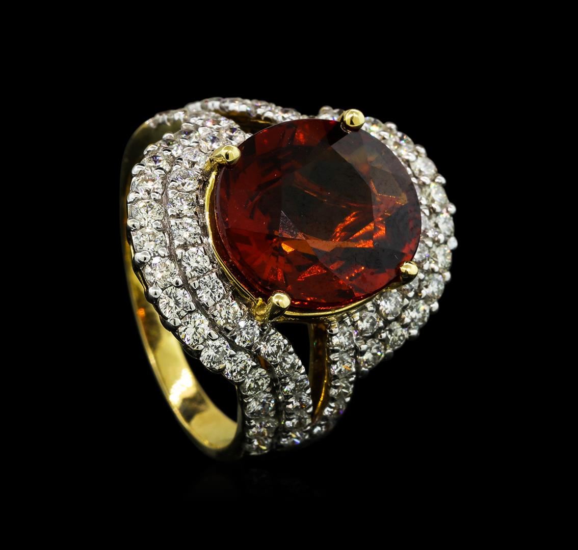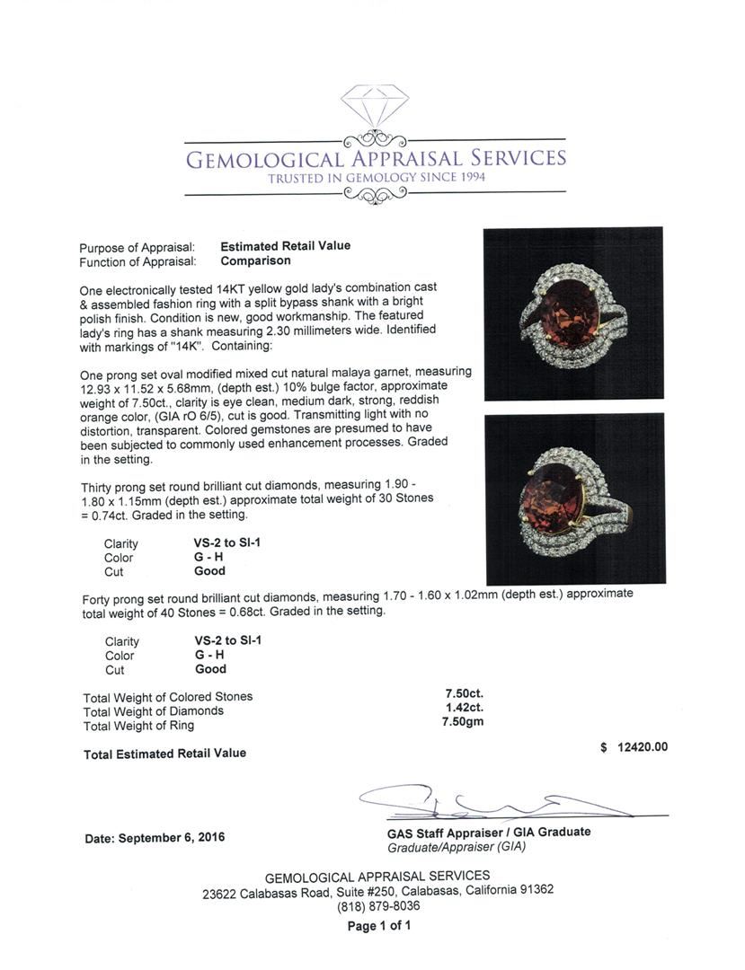 One electronically tested 14KT yellow gold lady's combination cast & assembled fashion ring with a split bypass shank with a bright polish finish. The featured lady's ring has a shank measuring 2.30 millimeters wide. Identified with markings of '14K'. Condition is new, good workmanship. Containing: One prong set oval modified mixed cut natural malaya garnet, measuring 12.93 x 11.52 x 5.68mm, (depth est.) 10%. bulge factor, approximate weight of 7.50ct., clarity is eye clean, medium dark, strong, reddish orange color, (GIA rO 6/5), cut is good. Transmitting light with no distortion, transparent. Colored gemstones are presumed to have been subjected to commonly used enhancement processes. Graded in the setting. Thirty prong set round brilliant cut diamonds, measuring 1.90 - 1.80 x 1.15mm (depth est.) approximate total weight of 30 Stones = 0.74ct. Graded in the setting. Clarity VS-2 to SI-1. Color: G - H Cut Good Forty prong set round brilliant cut diamonds, measuring 1.70 - 1.60 x 1.02mm (depth est.) approximate total weight of 40 Stones = 0.68ct. Graded in the setting. Clarity VS-2 to SI-1. Color: G - H Cut Good. Total Weight of Colored Stones 7.50ct.. Total Weight of Diamonds 1.42ct.. Total Weight of Ring 7.50gm GAS Appraised at $12,420.00.