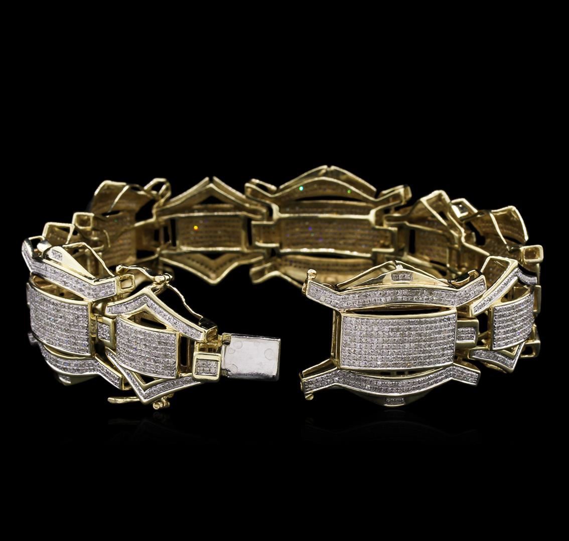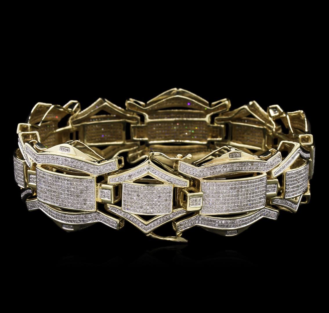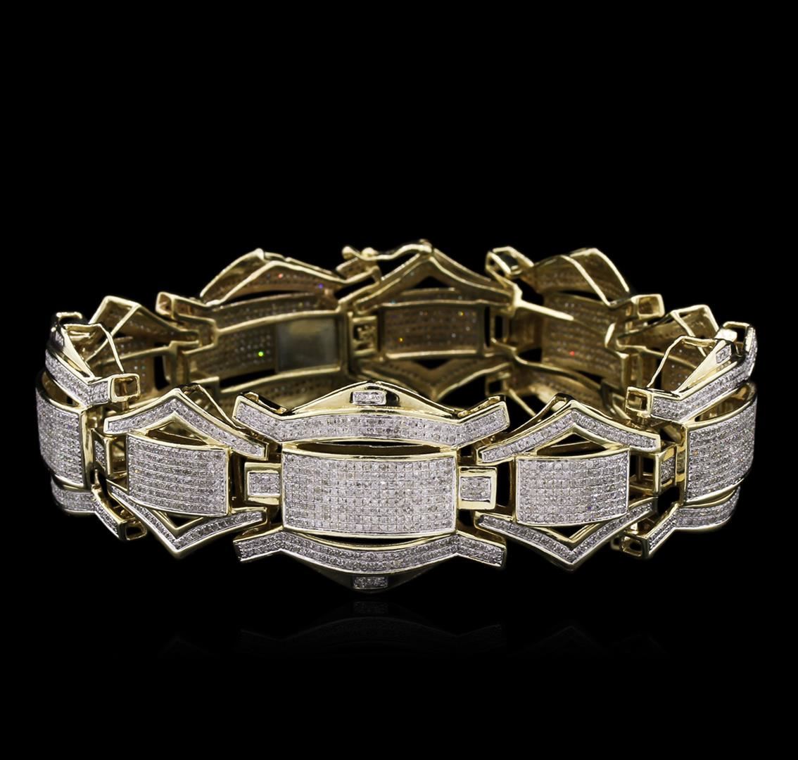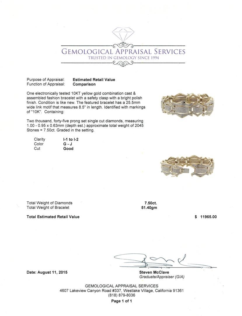One electronically tested 10KT yellow gold combination cast & assembled fashion bracelet with a safety clasp with a bright polish finish. The featured bracelet has a 25.5mm wide link motif that measures 8.5" in length. Identified with markings of "10K". Condition is like new. Containing: Two Thousand, Forty-Five prong set single cut diamonds, measuring 1.00 - 0.95 x 0.63mm (depth est.) approximate total weight of 2045 Stones = 7.50ct. Graded in the setting. Clarity: I-1 to I-2. Color: G - Good. Total Weight of Diamonds 7.50ct. Total Weight of Bracelet 51.40gm. GAS Appraised at $11,965.00.