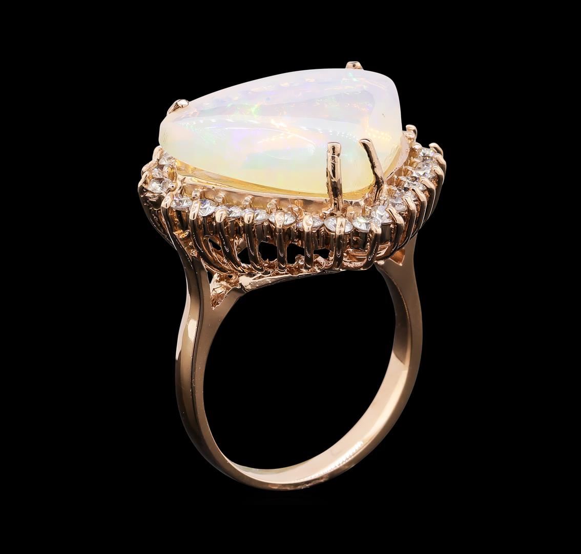 One electronically tested 14KT rose gold lady's cast fashion ring with a basket halo with a bright polish finish. The featured lady's ring has a shank measuring 2.67 millimeters wide. Identified with markings of 'K14'. Condition is new, good workmanship. Containing: One crystal opal that is cut in a triangle shaped cabochon and is prong set, measuring 15.21 mm long x 18.73 mm wide, and 5.50 mm thick and the approximate weight is 7.51 carats. The opal has a somewhat bright, multicolor play of color (fire) in a rolling flashfire pattern; a medium dome; a good cut; no inclusions; consistent in its brightness and pattern; and is not directional. Graded in the setting. Twenty-Seven prong set round brilliant cut diamonds, measuring 2.10 - 2.00 x 1.25mm (depth est.) approximate total weight of 27 Stones = 0.86ct. Graded in the setting. Clarity SI-1 to SI-2. Color: H - I Cut Good. Total Weight of Diamonds 0.86ct.. Total Weight of Opals 7.51ct.. Total Weight of Ring 9.80gm. GAS Appraised at $4,695.00.