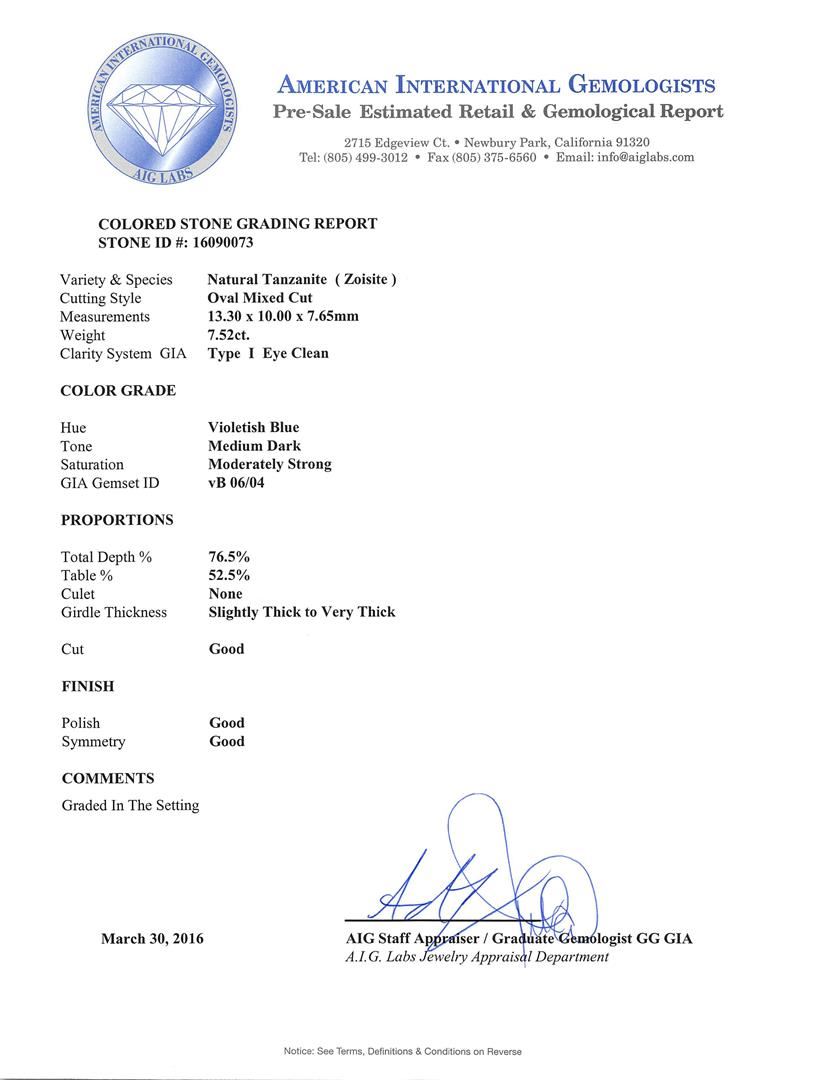 One electronically tested 14KT white gold ladies cast tanzanite and diamond pendant with chain. The pendant features a tanzanite set within a diamond floret completed by a grooved bail. The pendant is supported by an eighteen inch length 14KT white gold cable chain, terminating in a lobster claw clasp. Bright polish finish. Condition is new, good workmanship. Containing: One prong set oval mixed cut natural tanzanite, measuring 13.30 x 10.00 x 7.65mm, 5%. bulge factor, approximate weight of 7.52ct., clarity is eye clean, type I, medium dark, moderately strong, violetish blue color, (GIA vB 6/4), cut is good. Transmitting light with no distortion, transparent. Colored Stone Grading Report attached. Graded in the setting. Tanzanite is a very rare gemstone that is only found in the country of Tanzania. Originally discovered in 1967. Tiffany & Company, named the stone Tanzanite. It is found in the Usumburu Mountains that border the Umba Valley of northern Tanzania. Tanzanite occurs in gray, brown, violet, blue, reddish-purple, & green. The gem is interesting because of its exceptional pleochroism. Rotated in different directions a tanzanite will exhibit multiple changes of color. Tanzanite has a low tolerance to ultrasonic cleaning, and should not be cleaned using this method. Thirty-Two prong set round brilliant cut diamonds, measuring 1.70 - 1.70 x 1.02mm (depth est.) approximate. Total Weight of 32 Stones = 0.60ct. Graded in the setting. Clarity: SI-2 to I-2. Color: F - H. Total Weight of Colored Stones 7.52ct. Total Weight of Diamonds 0.60ct. Total Weight of Pendant With Chain 7.53gm. AIG Appraised at $19,965.00.