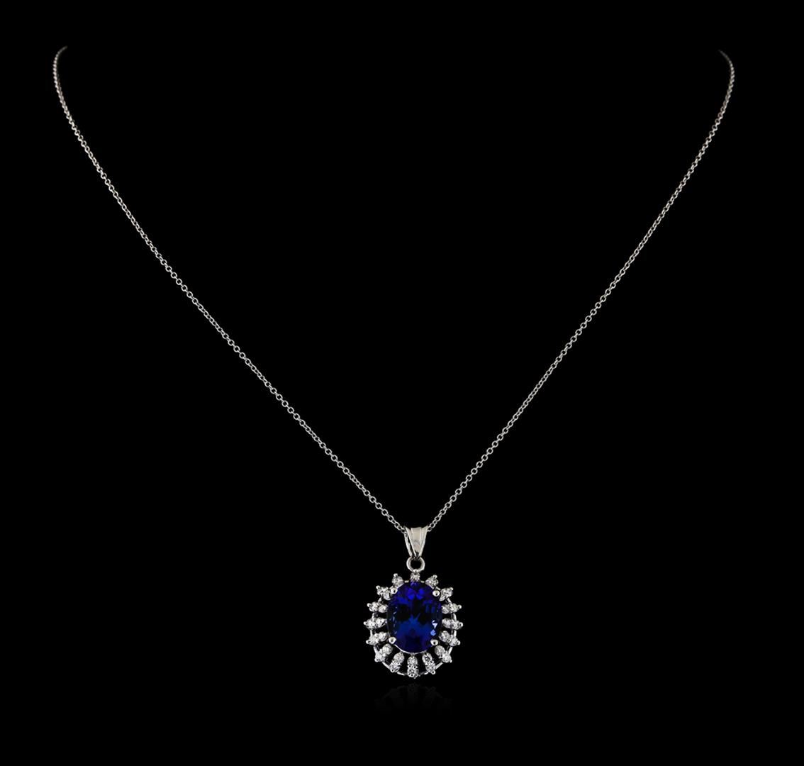 One electronically tested 14KT white gold ladies cast tanzanite and diamond pendant with chain. The pendant features a tanzanite set within a diamond floret completed by a grooved bail. The pendant is supported by an eighteen inch length 14KT white gold cable chain, terminating in a lobster claw clasp. Bright polish finish. Condition is new, good workmanship. Containing: One prong set oval mixed cut natural tanzanite, measuring 13.30 x 10.00 x 7.65mm, 5%. bulge factor, approximate weight of 7.52ct., clarity is eye clean, type I, medium dark, moderately strong, violetish blue color, (GIA vB 6/4), cut is good. Transmitting light with no distortion, transparent. Colored Stone Grading Report attached. Graded in the setting. Tanzanite is a very rare gemstone that is only found in the country of Tanzania. Originally discovered in 1967. Tiffany & Company, named the stone Tanzanite. It is found in the Usumburu Mountains that border the Umba Valley of northern Tanzania. Tanzanite occurs in gray, brown, violet, blue, reddish-purple, & green. The gem is interesting because of its exceptional pleochroism. Rotated in different directions a tanzanite will exhibit multiple changes of color. Tanzanite has a low tolerance to ultrasonic cleaning, and should not be cleaned using this method. Thirty-Two prong set round brilliant cut diamonds, measuring 1.70 - 1.70 x 1.02mm (depth est.) approximate. Total Weight of 32 Stones = 0.60ct. Graded in the setting. Clarity: SI-2 to I-2. Color: F - H. Total Weight of Colored Stones 7.52ct. Total Weight of Diamonds 0.60ct. Total Weight of Pendant With Chain 7.53gm. AIG Appraised at $19,965.00.