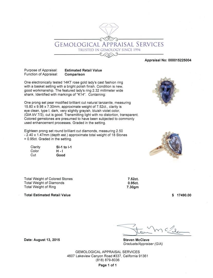 One electronically tested 14KT rose gold lady's cast fashion ring with a basket setting with a bright polish finish. The featured lady's ring 2.32 millimeter wide shank. Identified with markings of "K14". Condition is new, good workmanship. Containing: One prong set pear modified brilliant cut natural tanzanite, measuring 15.80 x 9.98 x 7.30mm, approximate weight of 7.52ct., clarity is eye clean, type I, dark, very slightly grayish, bluish violet color, (GIA bV 7/3), cut is good. Transmitting light with no distortion, transparent. Colored gemstones are presumed to have been subjected to commonly used enhancement processes. Graded in the setting. Eighteen prong set round brilliant cut diamonds, measuring 2.50 - 2.40 x 1.47mm (depth est.) approximate total weight of 18 Stones = 0.95ct. Graded in the setting. Clarity: SI-1 to I-1. Color: H - I. Cut Good. Total Weight of Colored Stones 7.52ct. Total Weight of Diamonds 0.95ct. Total Weight of Ring 7.30gm. GAS Appraised at $17,490.00.