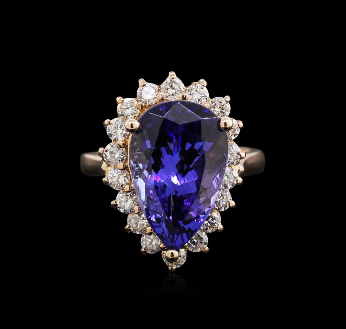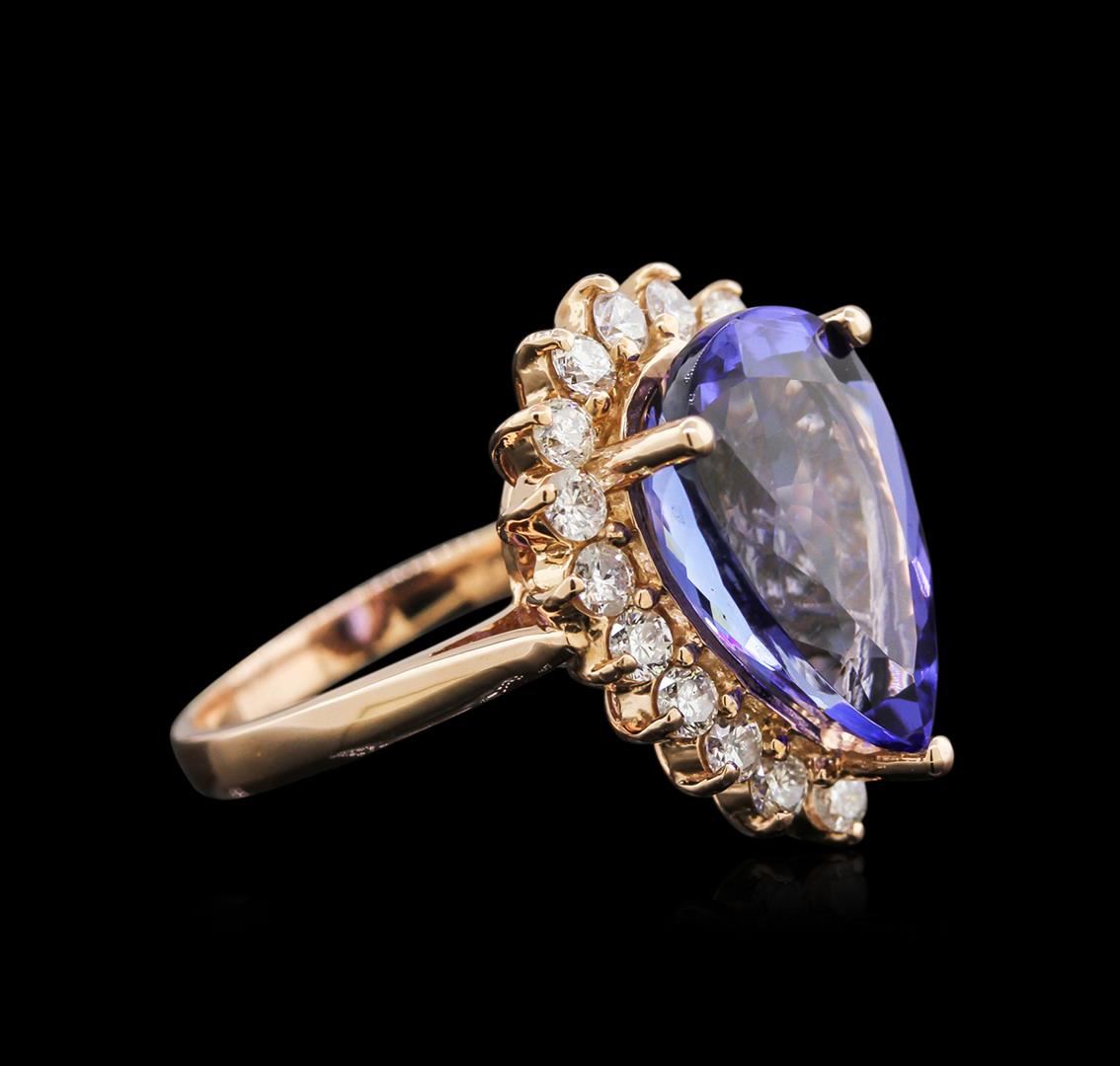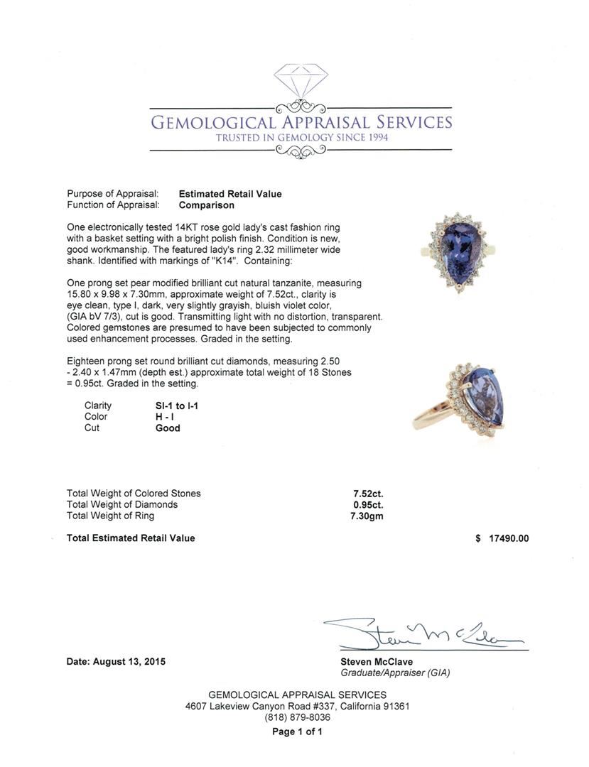 One electronically tested 14KT rose gold lady's cast fashion ring with a basket setting with a bright polish finish. The featured lady's ring 2.32 millimeter wide shank. Identified with markings of "K14". Condition is new, good workmanship. Containing: One prong set pear modified brilliant cut natural tanzanite, measuring 15.80 x 9.98 x 7.30mm, approximate weight of 7.52ct., clarity is eye clean, type I, dark, very slightly grayish, bluish violet color, (GIA bV 7/3), cut is good. Transmitting light with no distortion, transparent. Colored gemstones are presumed to have been subjected to commonly used enhancement processes. Graded in the setting. Eighteen prong set round brilliant cut diamonds, measuring 2.50 - 2.40 x 1.47mm (depth est.) approximate total weight of 18 Stones = 0.95ct. Graded in the setting. Clarity: SI-1 to I-1. Color: H - I. Cut Good. Total Weight of Colored Stones 7.52ct. Total Weight of Diamonds 0.95ct. Total Weight of Ring 7.30gm. GAS Appraised at $17,490.00.