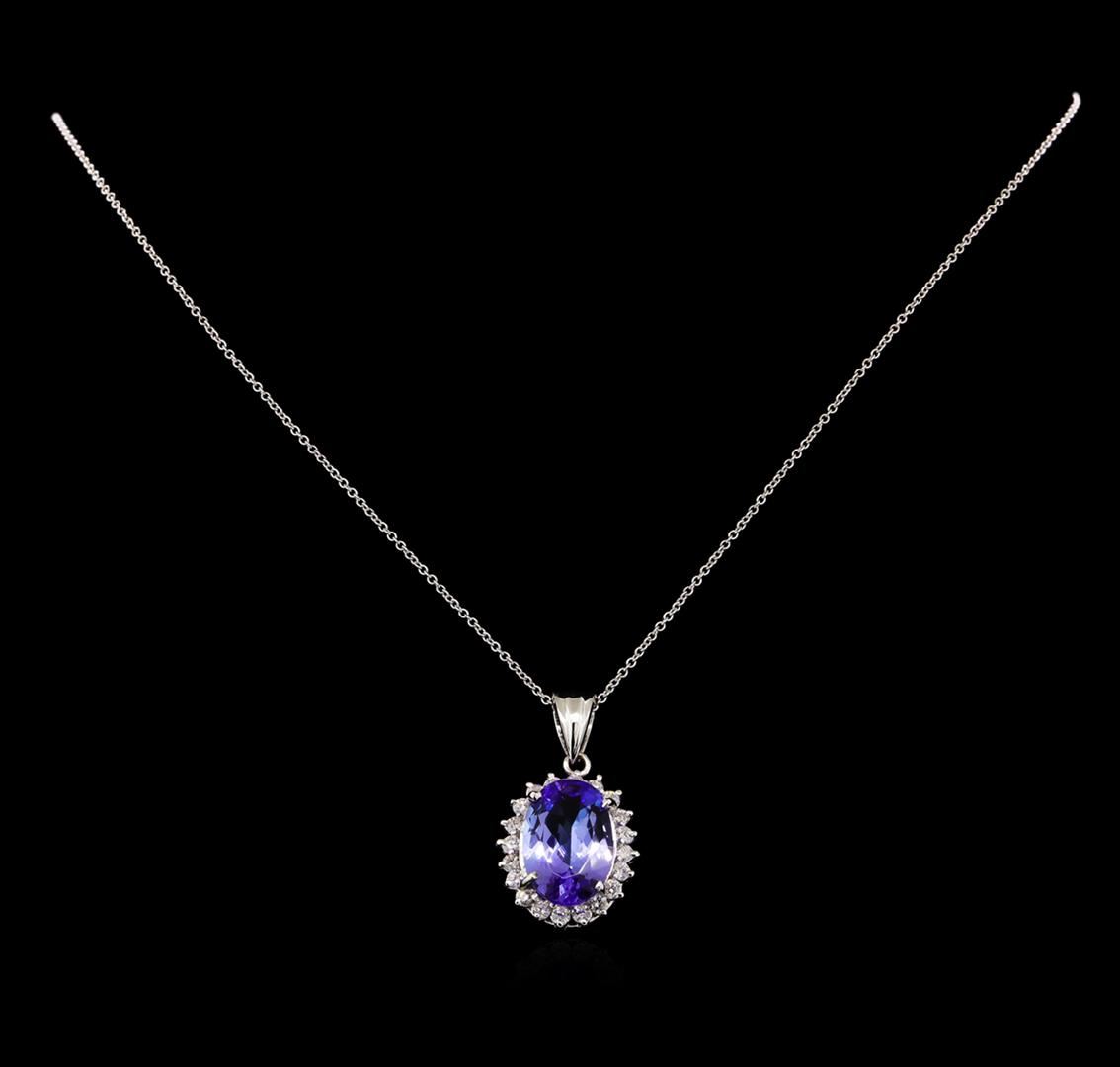 One electronically tested 14KT white gold lady's combination cast & assembled fashion pendant & chain 18.0" long, 1.2mm round cable link with a lobster claw clasp with a basket halo with a bright polish finish. Identified with markings of "14K". Condition is new, good workmanship. Containing: One prong set oval modified brilliant cut natural tanzanite, measuring 15.99 x 10.87 x 6.05mm, approximate weight of 7.55ct., clarity is eye clean, type I, medium light, moderately strong, violetish blue color, (GIA vB 4/4), cut is very good. Transmitting light with no distortion, transparent. Colored gemstones are presumed to have been subjected to commonly used enhancement processes. Graded in the setting. Twenty prong set round brilliant cut diamonds, measuring 2.30 - 2.20 x 1.37mm (depth est.) approximate total weight of 20 Stones = 0.85ct. Graded in the setting. Clarity: VS-2 to SI-2. Color: G - H. Cut Very Good. Total Weight of Colored Stones 7.55ct. Total Weight of Diamonds 0.85ct. Total Weight of Pendant & Chain 7.80gm. GAS Appraised at $13,465.00.