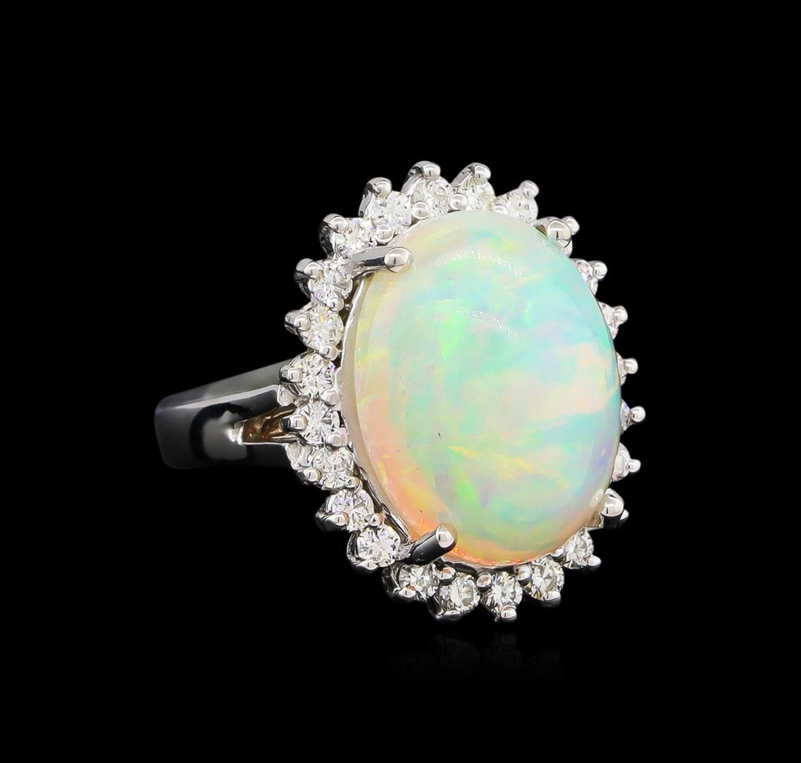 One ring featuring: 14KT white gold weighing 6.45 grams containing one opal with a total weight of 7.55ct and side diamonds with a total weight of 0.68ct.
