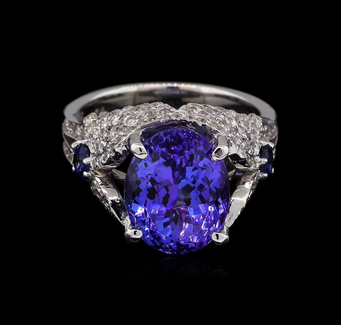 One electronically tested 14KT white gold lady's cast fashion ring with a cathedral split shank with a bright polish finish. The featured lady's ring has a shank measuring 3.51 millimeters wide. Identified with markings of "K14". Condition is new, good workmanship. Containing: One prong set oval modified brilliant cut natural tanzanite, measuring 12.29 x 9.90 x 8.07mm, 3%. bulge factor, approximate weight of 7.12ct., clarity is eye clean, type I, medium dark, very slightly grayish, violetish blue color, (GIA vB 6/3), cut is very good. Transmitting light with no distortion, transparent. Colored gemstones are presumed to have been subjected to commonly used enhancement processes. Graded in the setting. Two prong set round modified brilliant cut natural blue sapphires, measuring 3.50 - 3.45 x 2.27 mm, approximate total weight of 0.43ct., clarity is eye clean, type II, medium dark, strong, blue color, (GIA B 6/5), cut is very good. Colored gemstones are presumed to have been subjected to commonly used enhancement processes. Graded in the setting. Two round brilliant cut diamonds, measuring 1.90 - 1.80 x 1.15mm (depth est.) approximate total weight of 2 Stones = 0.05ct. Graded in the setting. One Hundred Seventy round brilliant cut diamonds, measuring 1.20 - 1.15 x 0.72mm (depth est.) approximate total weight of 170 Stones = 1.02ct. Graded in the setting. Total Weight of Colored Stones 7.55ct. Total Weight of Diamonds 1.07ct. Total Weight of Ring 9.70gm. GAS Appraised at $13,330.00.