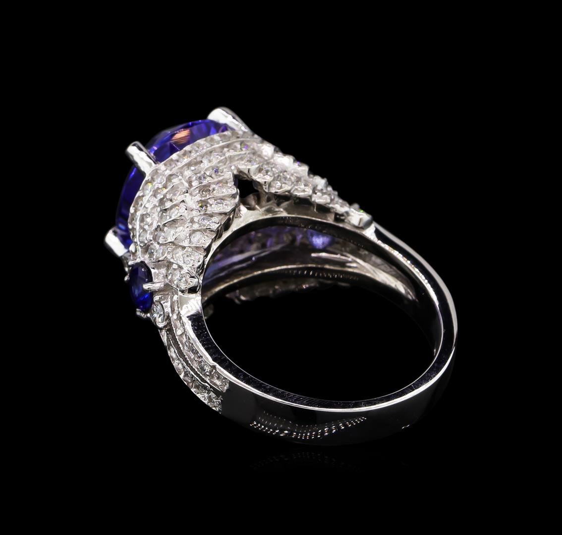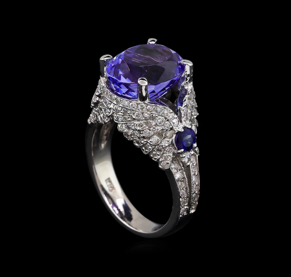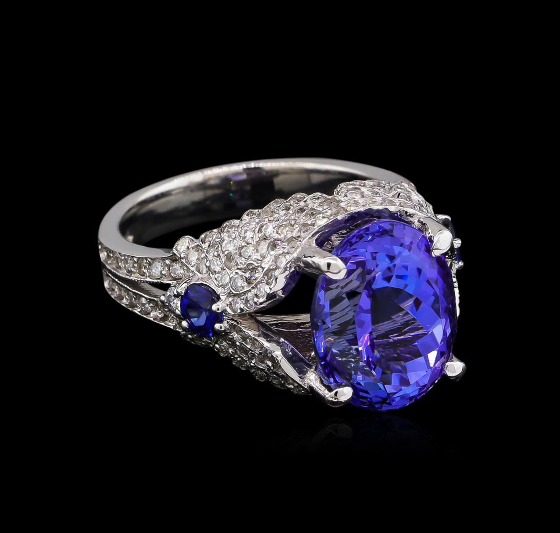 One electronically tested 14KT white gold lady's cast fashion ring with a cathedral split shank with a bright polish finish. The featured lady's ring has a shank measuring 3.51 millimeters wide. Identified with markings of "K14". Condition is new, good workmanship. Containing: One prong set oval modified brilliant cut natural tanzanite, measuring 12.29 x 9.90 x 8.07mm, 3%. bulge factor, approximate weight of 7.12ct., clarity is eye clean, type I, medium dark, very slightly grayish, violetish blue color, (GIA vB 6/3), cut is very good. Transmitting light with no distortion, transparent. Colored gemstones are presumed to have been subjected to commonly used enhancement processes. Graded in the setting. Two prong set round modified brilliant cut natural blue sapphires, measuring 3.50 - 3.45 x 2.27 mm, approximate total weight of 0.43ct., clarity is eye clean, type II, medium dark, strong, blue color, (GIA B 6/5), cut is very good. Colored gemstones are presumed to have been subjected to commonly used enhancement processes. Graded in the setting. Two round brilliant cut diamonds, measuring 1.90 - 1.80 x 1.15mm (depth est.) approximate total weight of 2 Stones = 0.05ct. Graded in the setting. One Hundred Seventy round brilliant cut diamonds, measuring 1.20 - 1.15 x 0.72mm (depth est.) approximate total weight of 170 Stones = 1.02ct. Graded in the setting. Total Weight of Colored Stones 7.55ct. Total Weight of Diamonds 1.07ct. Total Weight of Ring 9.70gm. GAS Appraised at $13,330.00.
