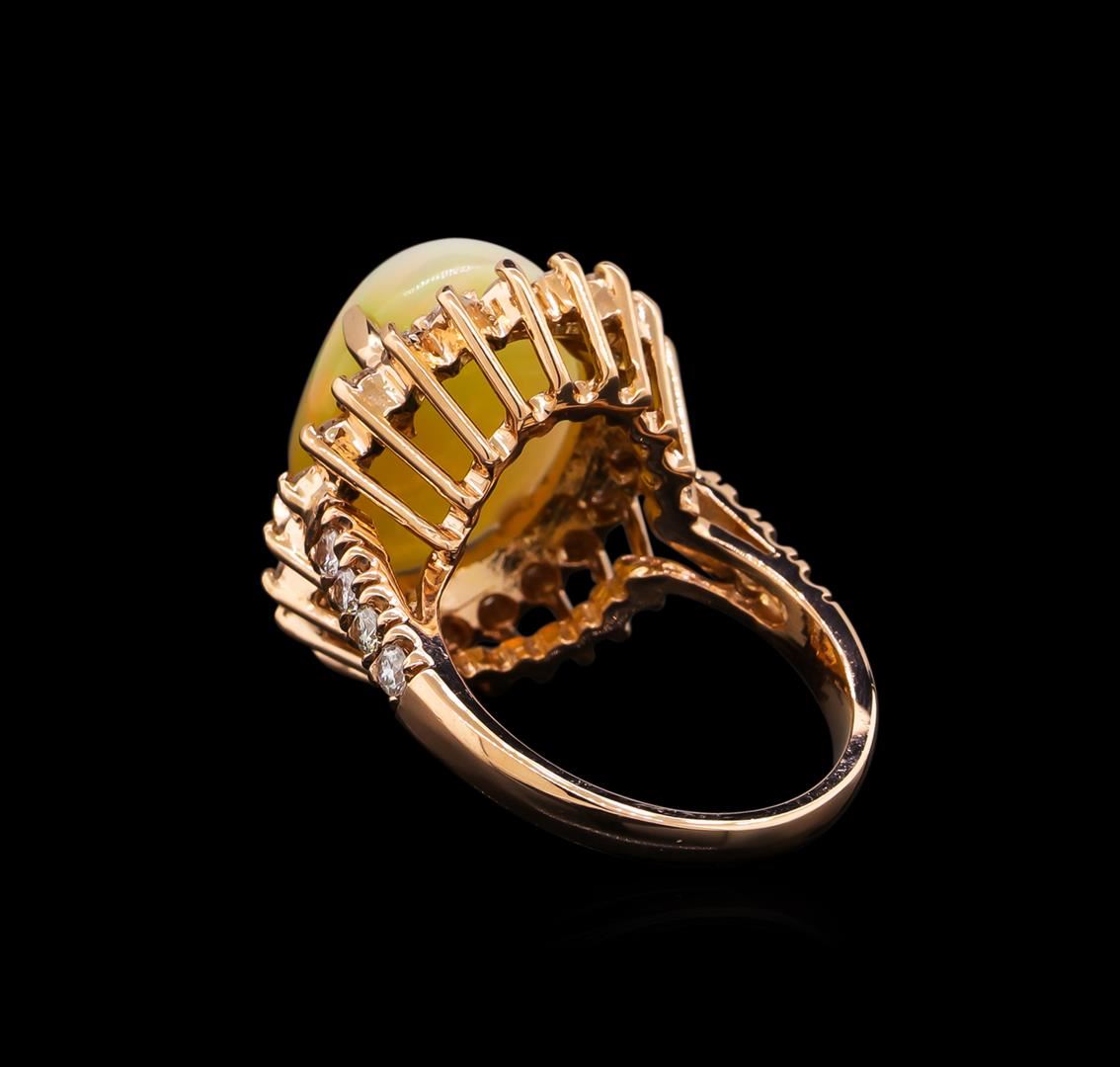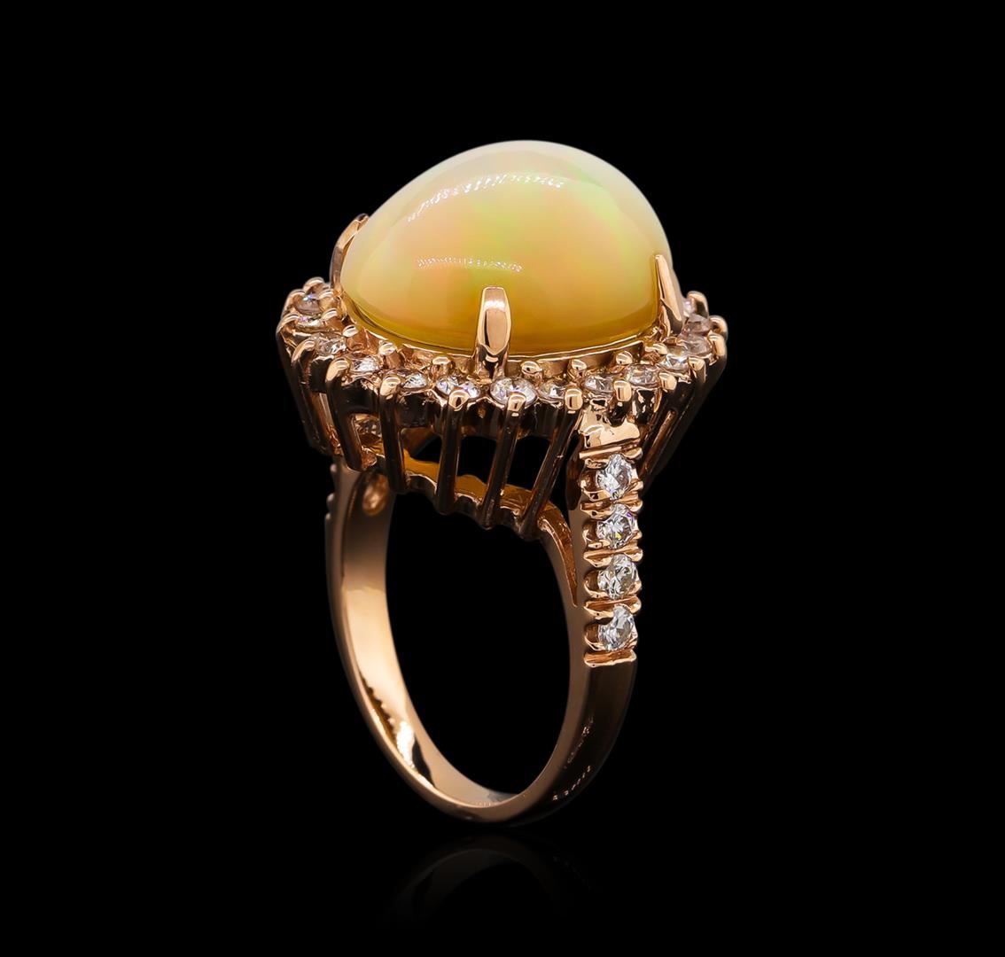 One electronically tested 14KT rose gold lady's cast fashion ring with a basket halo with a bright polish finish. The featured lady's ring has a shank measuring 2.34 millimeters wide. Identified with markings of "K14". Condition is new, good workmanship. Containing: One semi crystal opal that is cut in a oval shaped cabochon and is prong set, measuring 16.21 mm long x 12.77 mm wide, and 8.50 mm thick and the approximate weight is 7.57 carats. The opal has a bright, orange-green play of color (fire) in a rolling flashfire pattern; a high dome; a good cut; no inclusions; consistent in its brightness and pattern; and is not directional. Thirty prong set round brilliant cut diamonds, measuring 2.15 - 2.05 x 1.28mm (depth est.) approximate total weight of 30 Stones = 1.02ct. Graded in the setting. Clarity: SI-1 to SI-2. Color: H - I. Cut Good. Total Weight of Diamonds 1.02ct. Total Weight of Opals 7.57ct. Total Weight of Ring 9.00gm GAS Appraised.