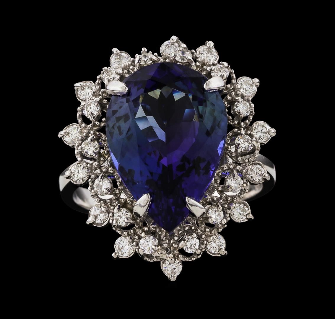 One electronically tested 14KT white gold lady's cast fashion ring with a staggered double basket halo with a bright polish with milgrain detailing finish. The featured lady's ring has a shank measuring 2.27 millimeters wide. Identified with markings of 'K14'. Condition is new, good workmanship. Containing: One prong set pear modified brilliant cut natural tanzanite, measuring 15.55 x 10.85 x 6.67mm, (depth est.) approximate weight of 7.60ct., clarity is eye clean, medium, moderately strong, violetish blue color, (GIA vB 5/4), cut is very good. Transmitting light with no distortion, transparent. Colored gemstones are presumed to have been subjected to commonly used enhancement processes. Graded in the setting. Fourteen prong set round brilliant cut diamonds, measuring 1.90 - 1.80 x 1.11mm (depth est.) approximate total weight of 14 Stones = 0.32ct. Graded in the setting. Clarity SI-1 to SI-3. Color: H - I Cut Good Fourteen prong set round brilliant cut diamonds, measuring 1.70 - 1.60 x 1.02mm (depth est.) approximate total weight of 14 Stones = 0.24ct. Graded in the setting. Clarity SI-1 to SI-2. Color: H - I Cut Good. Total Weight of Colored Stones 7.60ct.. Total Weight of Diamonds 0.56ct.. Total Weight of Ring 6.00gm. GAS Appraised at $12,115.00.