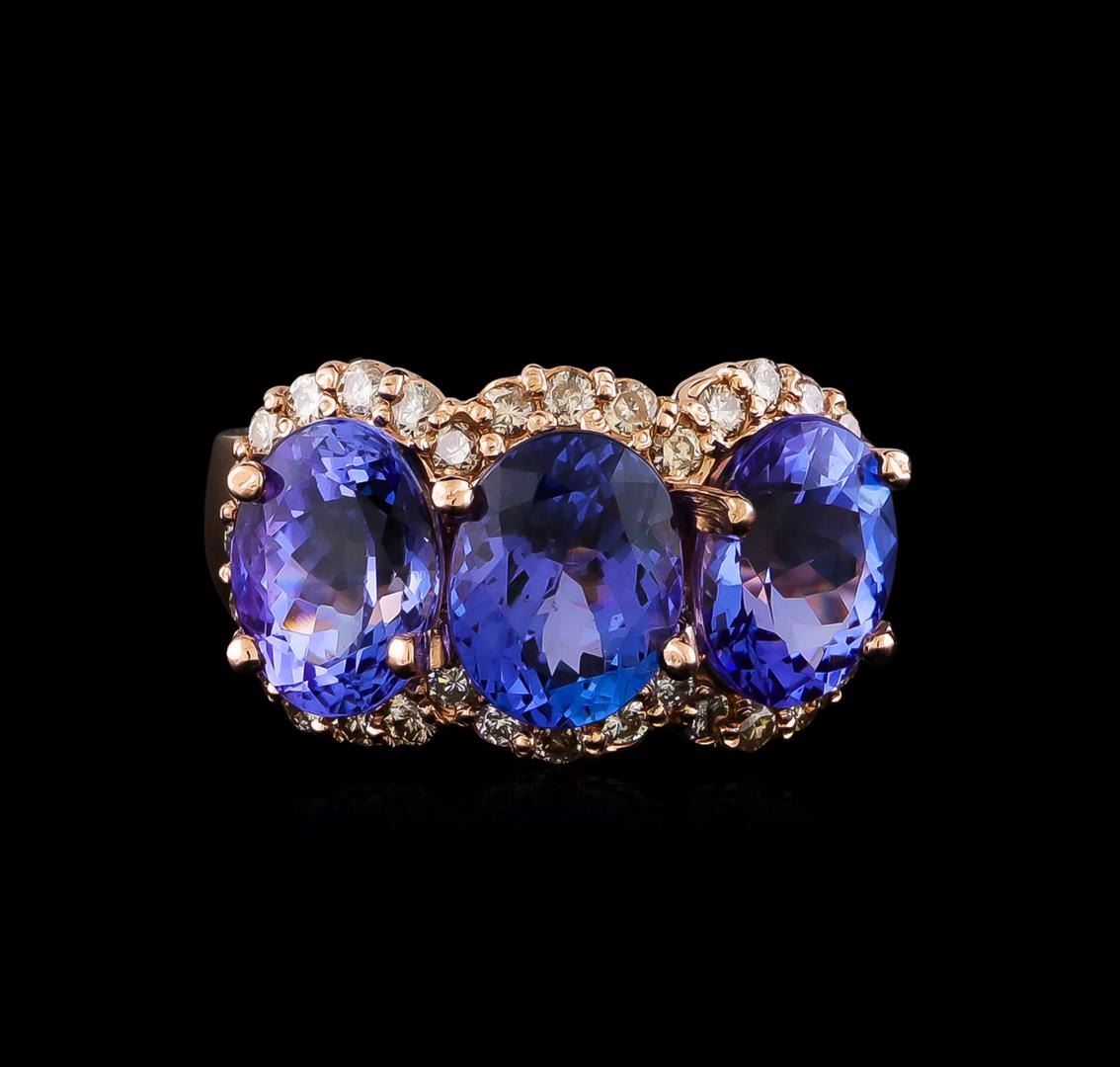 One electronically tested 14KT rose gold ladies cast tanzanite and diamond ring with a bright polish finish. The ring features a tanzanite trio set within a diamond bezel supported by tapering shoulders, completed by a three millimeter wide band. Identified with markings of "K14". Condition is new, good workmanship. Containing: Three prong set oval mixed cut natural tanzanites, measuring 9.50 x 7.30 x 5.20mm, approximate total weight of 7.62ct., clarity is eye clean, type I, medium, slightly grayish, bluish violet color, (GIA bV 5/2), cut is good. Transmitting light with no distortion, transparent. Measurements & the color grade are an average for the group. Graded in the setting. Tanzanite is a very rare gemstone that is only found in the country of Tanzania. Originally discovered in 1967. Tiffany & Company, named the stone Tanzanite. It is found in the Usumburu Mountains that border the Umba Valley of northern Tanzania. Tanzanite occurs in gray, brown, violet, blue, reddish-purple, & green. The gem is interesting because of its exceptional pleochroism. Rotated in different directions a tanzanite will exhibit multiple changes of color. Tanzanite has a low tolerance to ultrasonic cleaning, and should not be cleaned using this method. Thirty-Two prong set round brilliant cut diamonds, measuring 1.80 - 1.80 x 1.08mm (depth est.) approximate total weight of 32 Stones = 0.72ct. Color & clarity grade are an average for the group. Graded in the setting. Clarity: SI-2 to I-1. Color: H - J. Total Weight of Colored Stones 7.62ct. Total Weight of Diamonds 0.72ct. Total Weight of Ring 9.18gm. AIG Appraised at $15,750.00.