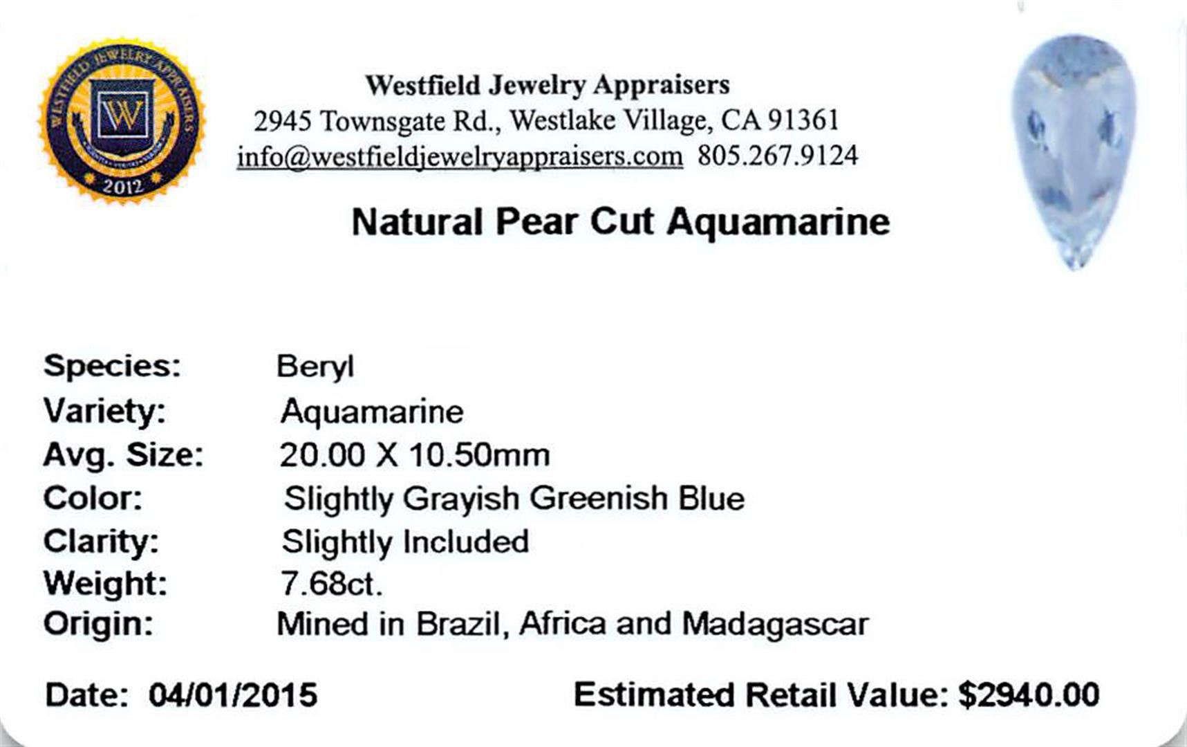 One pear cut natural aquamarine exact weight 7.63ct., clarity is slightly included, type I, medium, very slightly grayish, very slightly greenish blue color, (GIA vslgB 5/3), cut is good. Westfield Appraised at $2,940.00.