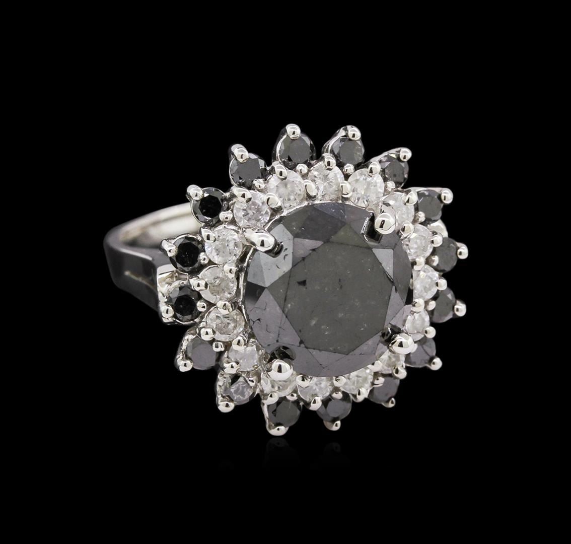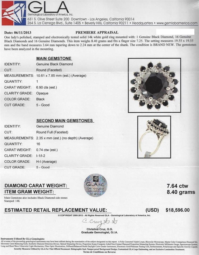 One lady's polished, stamped and electronically tested solid 14k white gold ring mounted with: 1 Genuine Black Diamond, 16 Genuine Black Diamonds and 16 Genuine Diamonds. This item weighs 8.40 grams and fits a finger size 7.25. The setting measures 19.55 x 19.55 mm and the band measures 3.64 mm tapering down to 2.24 mm at the center of the shank. The condition is Brand New. The gemstones have been analyzed in the mounting. Main Gemstone: Identity: Genuine Black Diamond. Cut: round (faceted). Measurements: 10.61-7.85 (est.) (Average). Quantity: 1. Carat Weight: 6.90 cts (est.). Clarity Grade: Opaque. Color Grade: Black. Cut Grade: 5-Good. Second Main Gemstones: Identity: Genuine Diamond. Cut: Round Full (faceted). Measurements: 2.35 x mm (no depth) (Range). Quantity: 16. Carat Weight: 0.74 ctw (est.). Clarity Grade: I-1/I-2. Color Grade: H-I (Average). Cut Grade: 5-Good. Diamond Carat Weight: 7.64ctw. Item Gram Weight: 8.40 grams. GLA Appraised at $18,596.00.